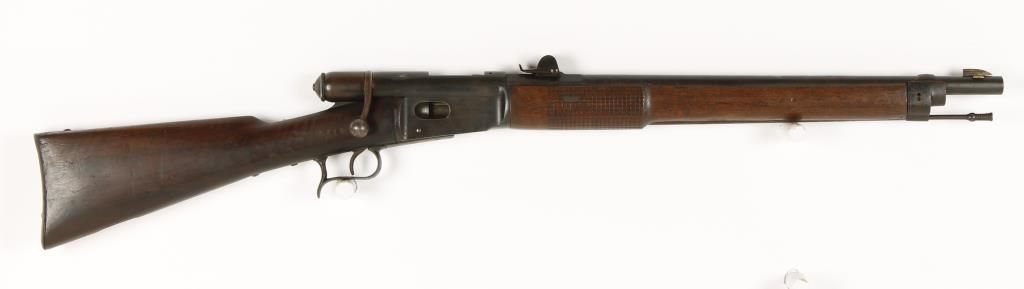 Early swiss bolt action military carbine with 20" barrel. Front sight has been replaced with brass blade sight, otherwise maintains original configuration. Good working action. Condition: Good overall with light scattered pitting and wood is good missing rear sling swivel. *Antique Firearm*