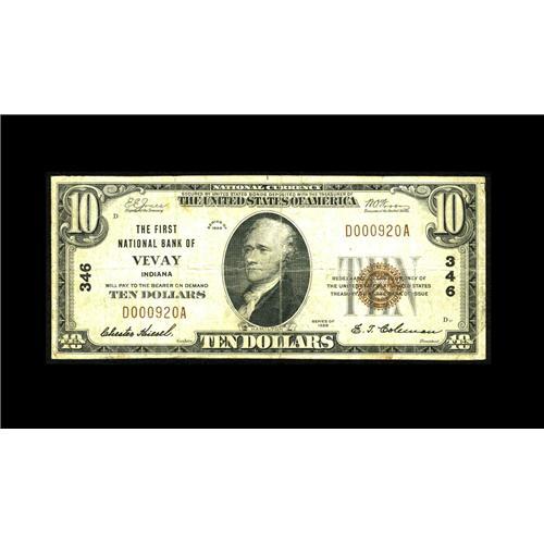 <B>Vevay, IN</B></I> - $10 1929 Ty. 1 <B>The First NB</B></I> Ch. # 346<BR>This <B>Very Fine</B></I> example is only the second Type 1 $10 to surface from this small Switzerland County community just across the Ohio River from Kentucky. It is actually scarcer in small than large, with six pieces now documented. This offering should see considerable bidding competition as it is a locale on a number of want lists. A generous bid will reward the successful aspirant with a note that will require a considerable wait for the frustrated underbidders before another of this type and denomination comes on the market after tonight. Our estimate may well prove conservative.