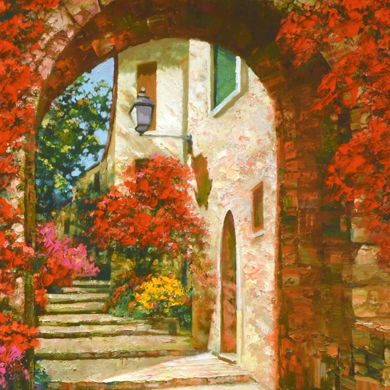With bright colors and lush textures, Howard Behrens' artwork adds a tropical and exotic feel to any art collection. "Via St. Tropez" is a limited edition hand embellished giclee on canvas. Numbered and hand signed by the artist. Includes Certificate of Authenticity! Measures approx. 20" x 27"(image).