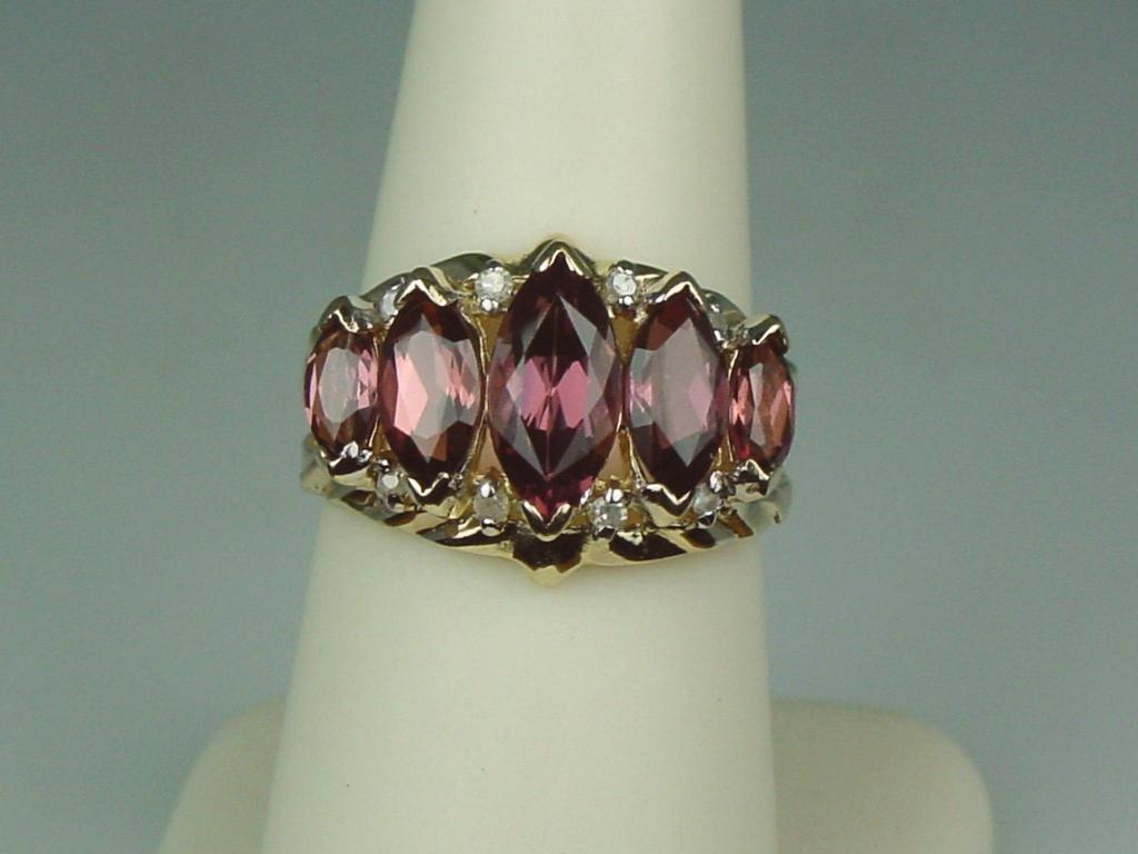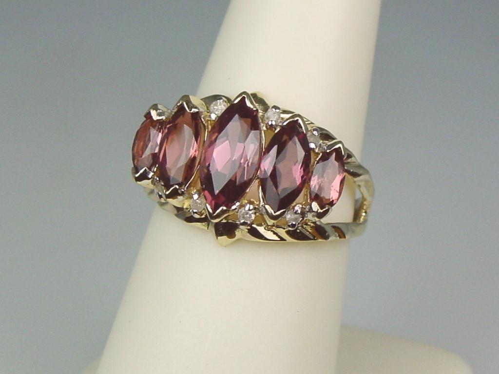 Vibrant 10K Yellow Gold Ladies Ring Fine set with 5 MQ cut pink tourmaline weighing approx. 3.00 carats and 8 round cut diamonds. Retail: $1,450.00Fine set with 5 MQ cut pink tourmaline weighing approx. 3.00 carats and 8 round cut diamonds. Retail: $1,450.00
