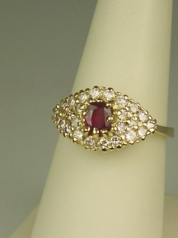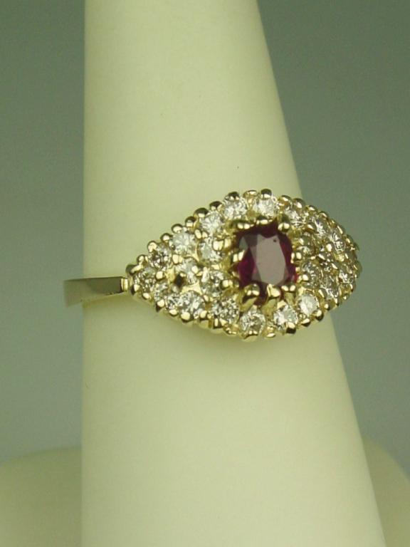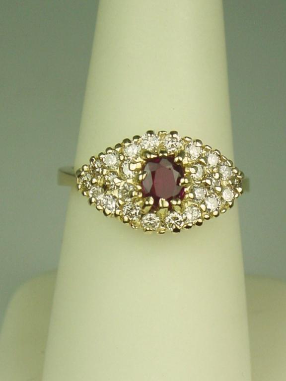 Vibrant 14 karat yellow gold ladies ring set with a center red ruby weighing approx. 0.60 carats and pave set with over 24 round diamonds weighing approx. 0.75 carats of G-H colors and SI clarity. Retail $2,350.00Estimate $600-$1,000