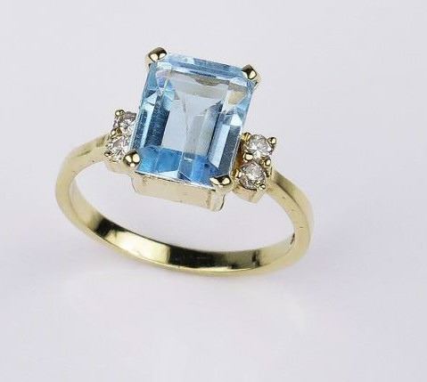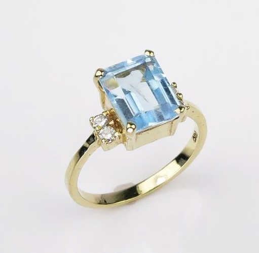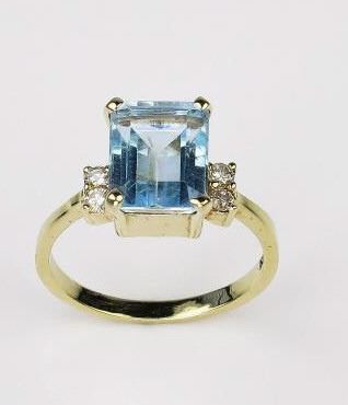 Vibrant FINE emerald cut Aquamarine and Diamond ring with approx. 3.00 carat Aquamarine and 4 round cut diamonds weighing approx. 0.10 carats of G-H colors set in 14 karat yellow gold setting. Retail $1,000- $1,500 Estimate $600-$900
