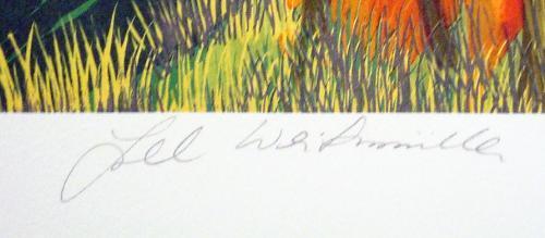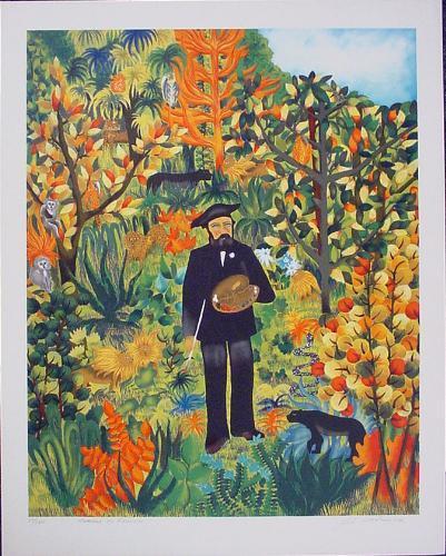 This interesting print, showing elements of many famous Henri Rousseau paintings (Self-Portrait from L'ile Saint Louis, The Dream and other images from the jungle paintings), is a fine art print on Arches like paper, signed by noted artist Lee Weihmuller: