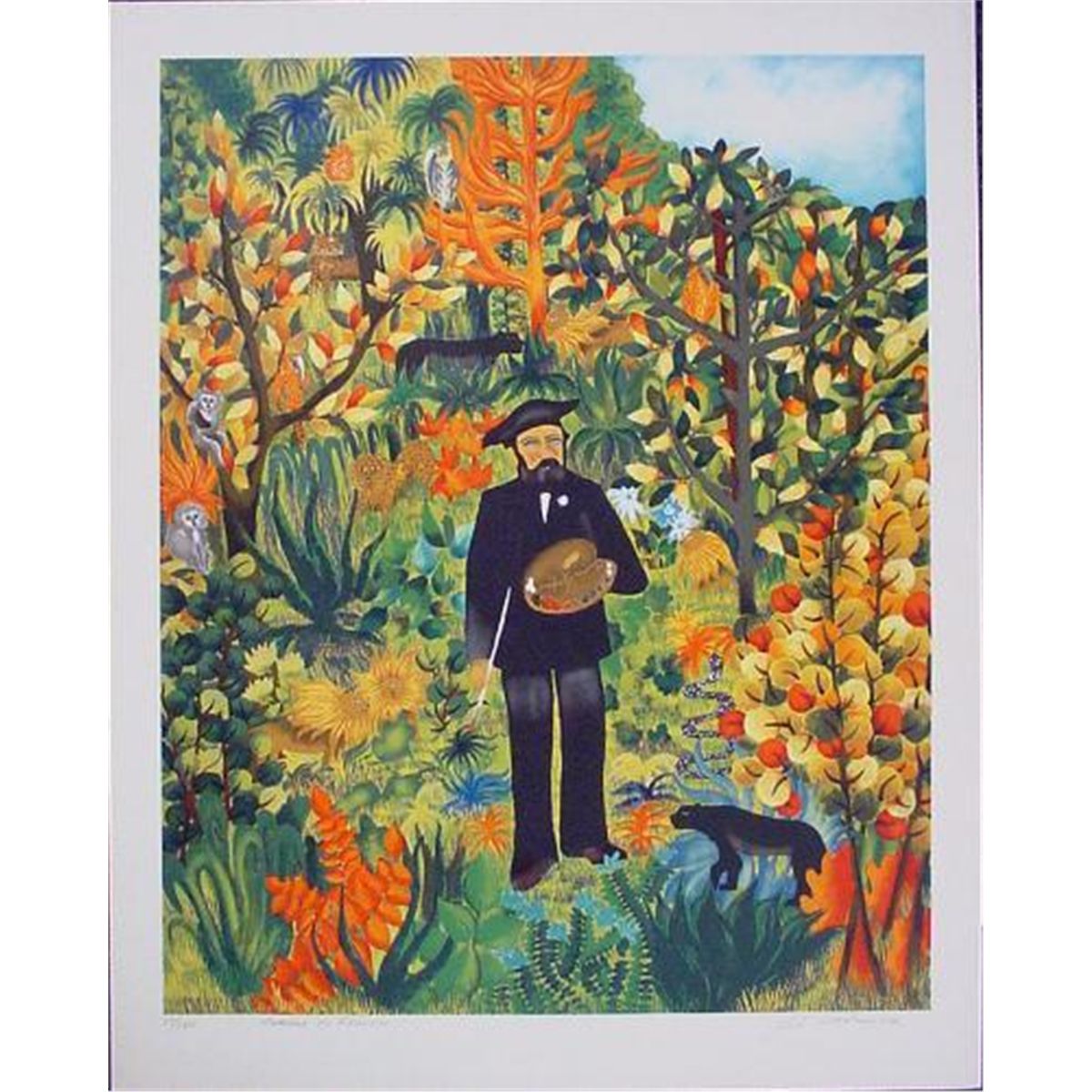 This interesting print, showing elements of many famous Henri Rousseau paintings (Self-Portrait from L'ile Saint Louis, The Dream and other images from the jungle paintings), is a fine art print on Arches like paper, signed by noted artist Lee Weihmuller: * Title: "Homage to Rousseau" written in pencil LL * Artist's signature in pencil LR * Numbered in pencil LL * Sheet size: 21½ × 27 * UL and LL corner creases readily matted out * Very good condition; bright and fresh * Certificate of Authenticity provided by Midwest Estate Buyers * * An art bargain!
