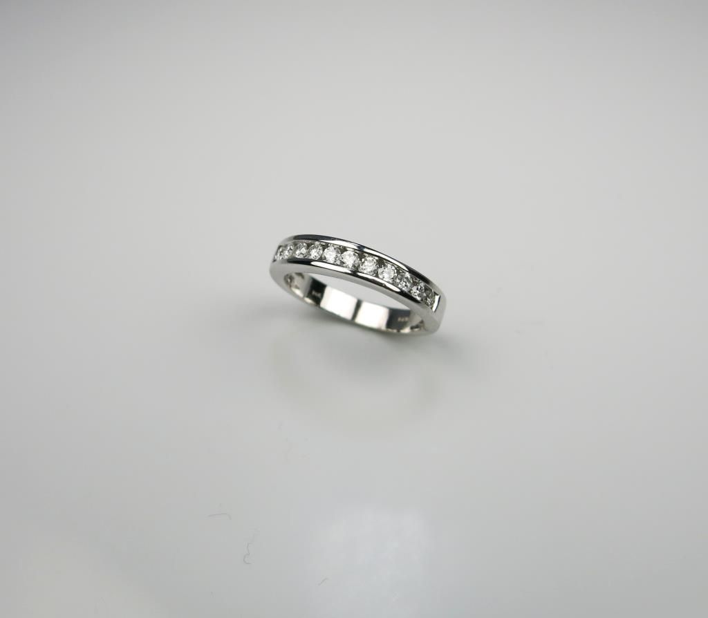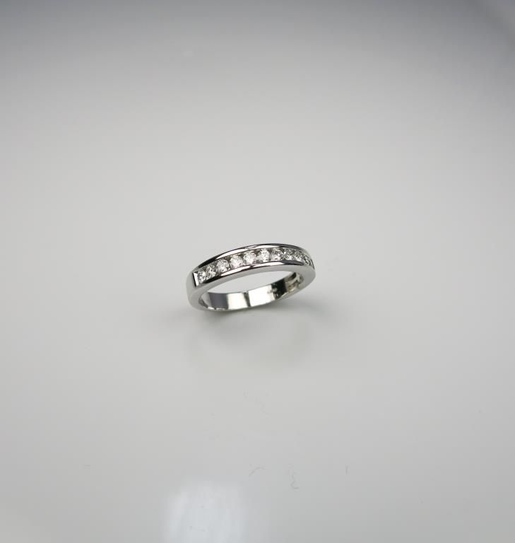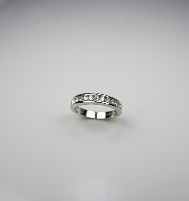 Vibrant Ladies Diamond Anniversary Band with 11 round brilliant cut channel set diamonds weighing approx. 0.60 carats with F-G color SI clarity set in 14 karat white gold. Retail $1,500-$2,000 Estimate $800-$1,200