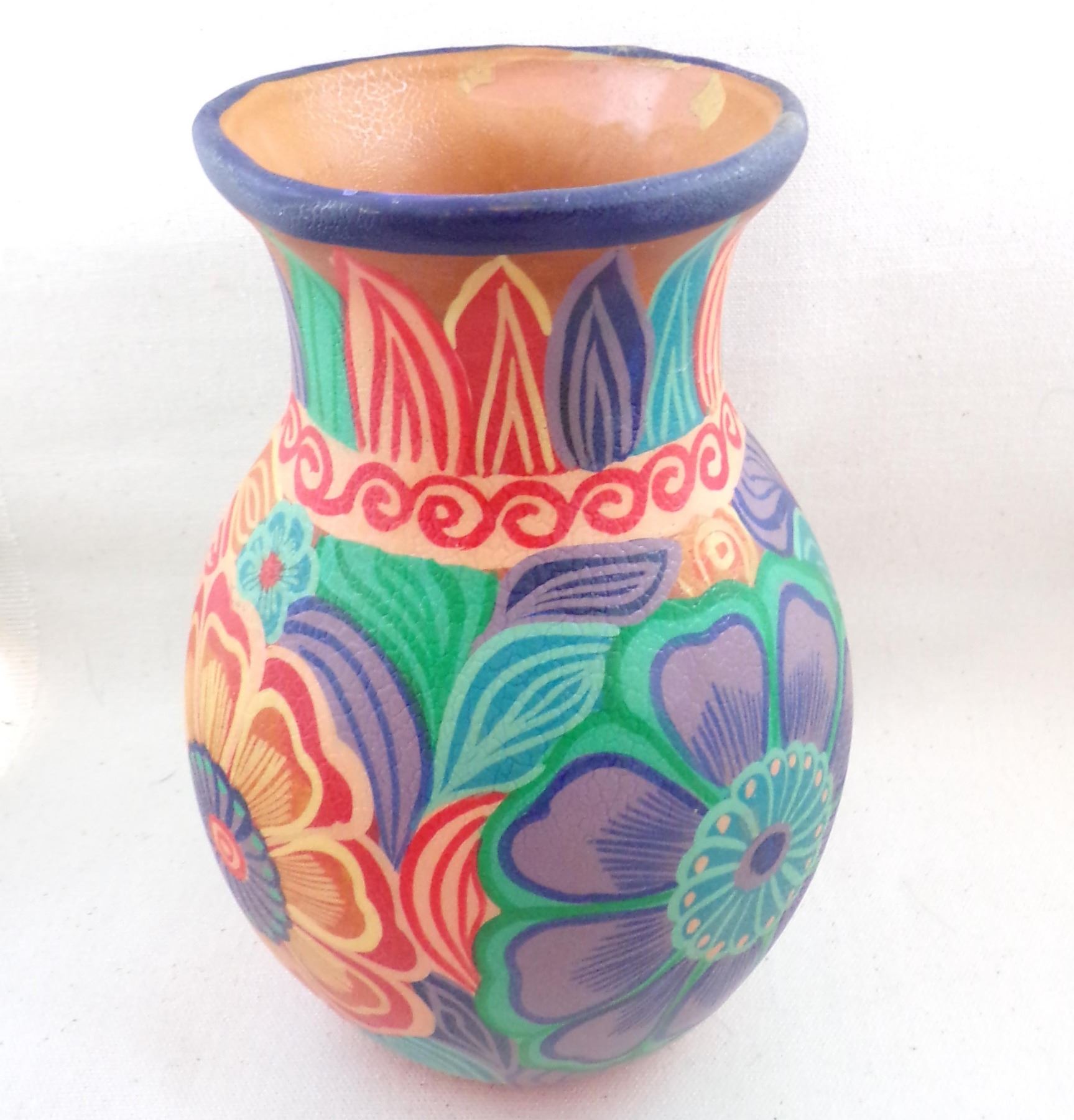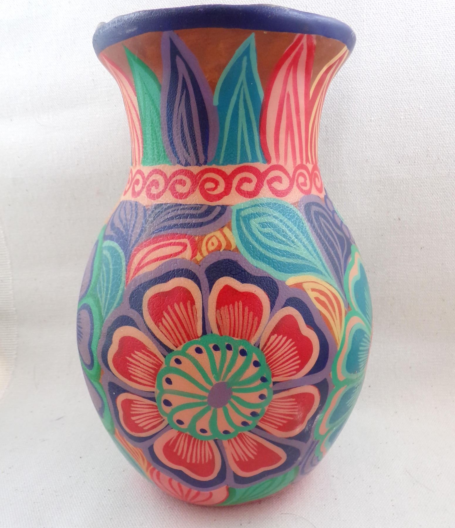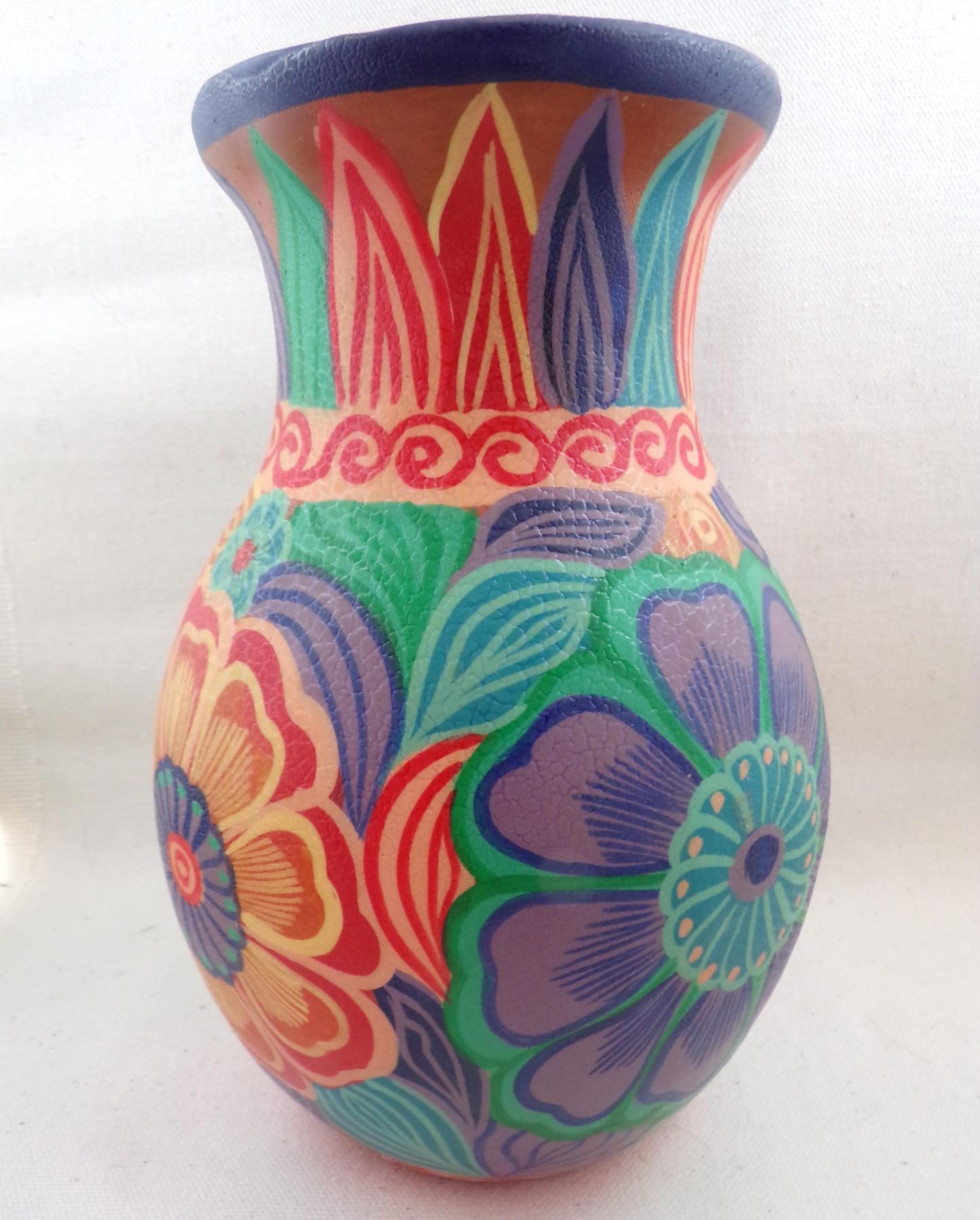 Vibrant Mexican Pottery Vase, measures 8.5"H x 6"D, signed on the bottom by the artist, absolutely gorgeous colors in floral motif