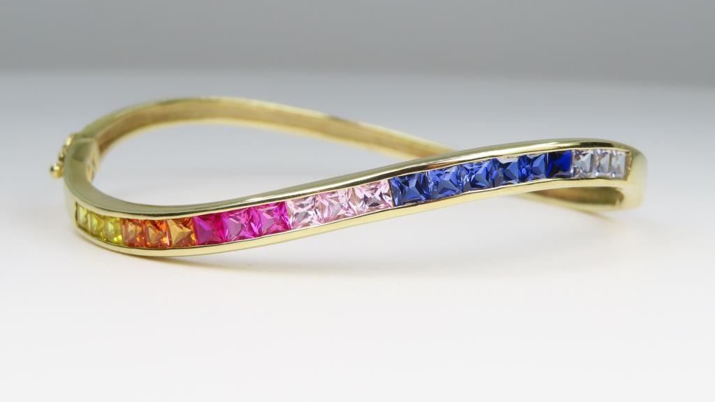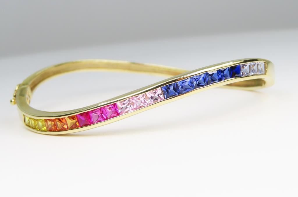 featuring 21 Princess cut Sapphires in Yellow, Orange, Pink, Red, Blue and Purple weighing approx. 8.00 carats channel set in a contemporary style masterfully crafted 14 karat yellow gold bangle setting weighing over 11.00 grams. Retail $3,000-$4,000
