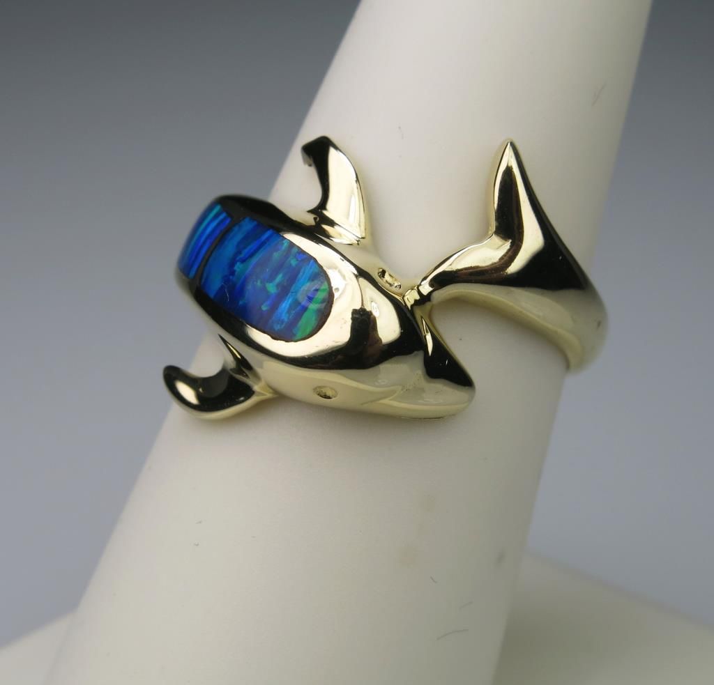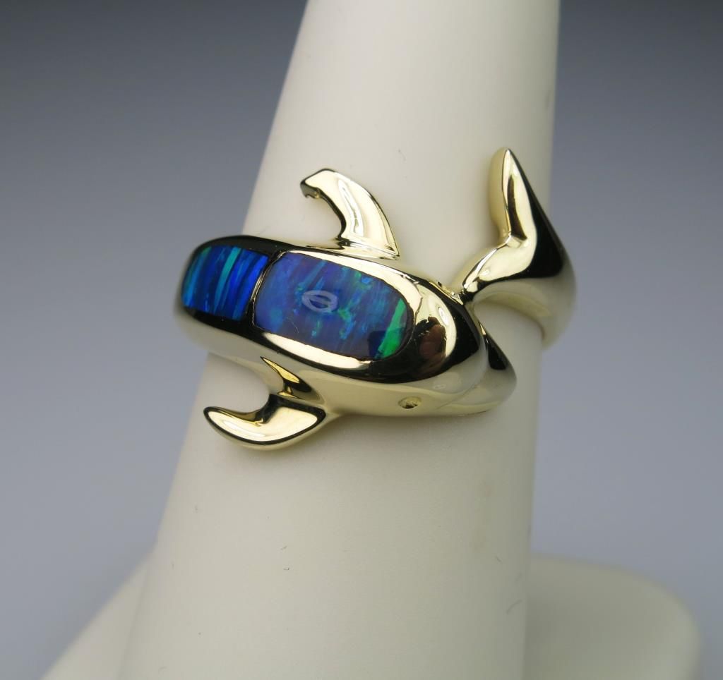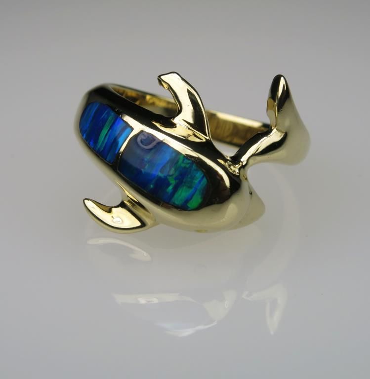 Vibrant Opal Dolphin Ring with 2 beautiful inlayed Opals with vibrant colors in rich blues and bright greens artistically made in 4.5 grams of 10 karat yellow gold. Retail $700-$1,000 Estimate $400-$500