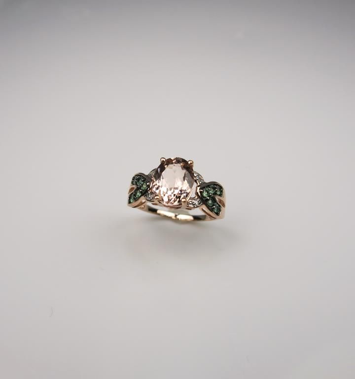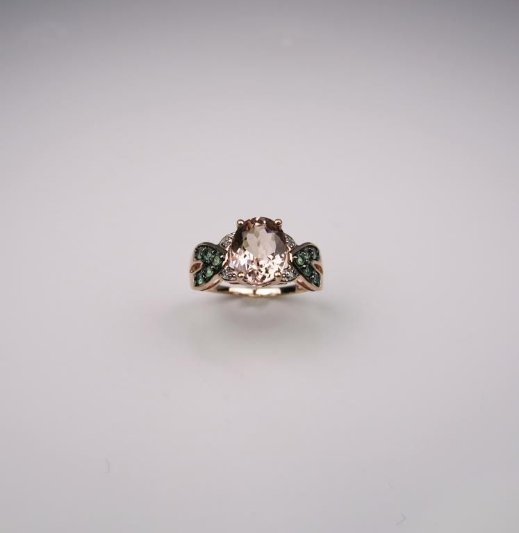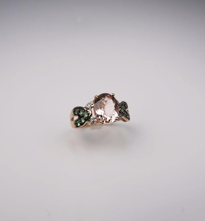 Vibrant Pink Morganite Ring with Green Tourmaline and Diamonds Morganite weight approx. 4.00 carats set in 10 karat Rose gold. Retail $1,400-$1,800 Estimate $800-$1,000 Nice.
