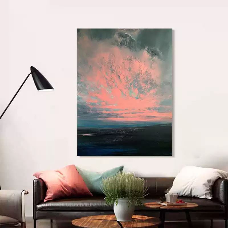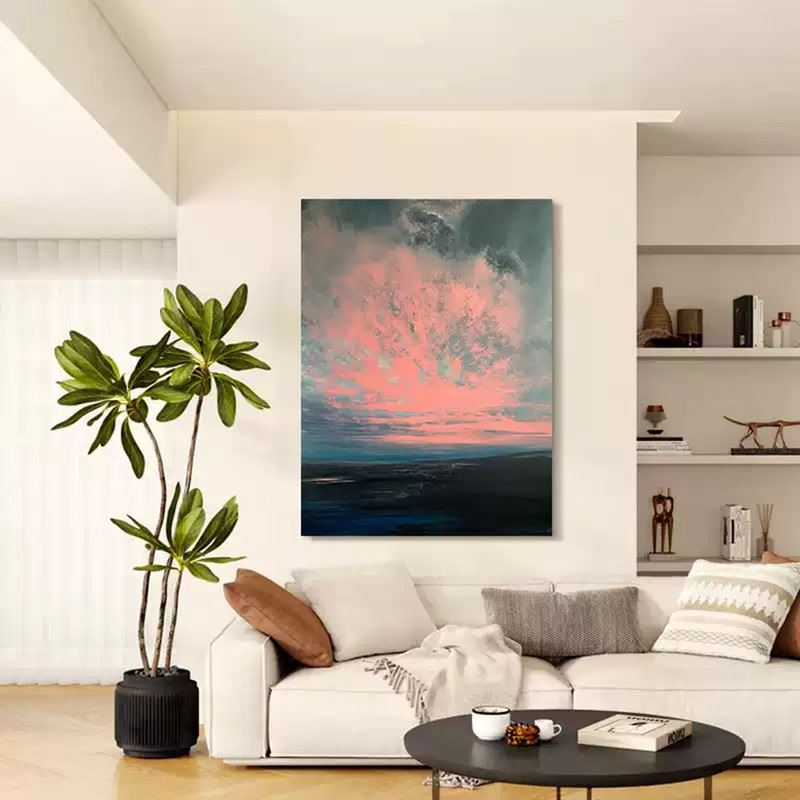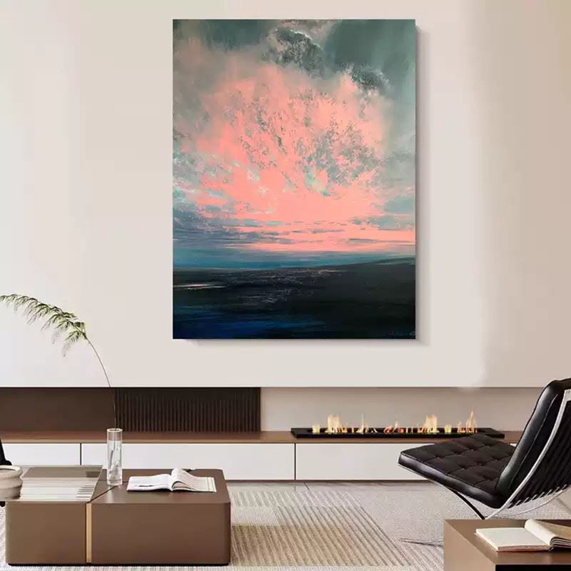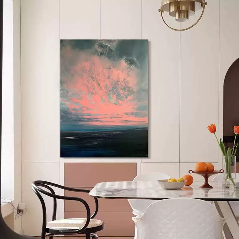 This artwork depicts the grandeur and mystery of nature through vibrant sunset clouds and thick mist. The contrast of warm pinks and oranges with deep blues conveys a profound sky scene, as if the clouds are slowly rising, evoking a sense of tranquility and magnificence. Dimensions: 24 x 31 inches.