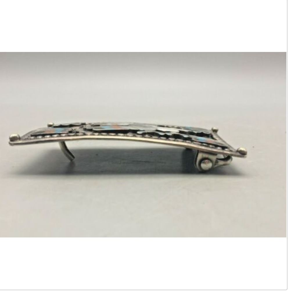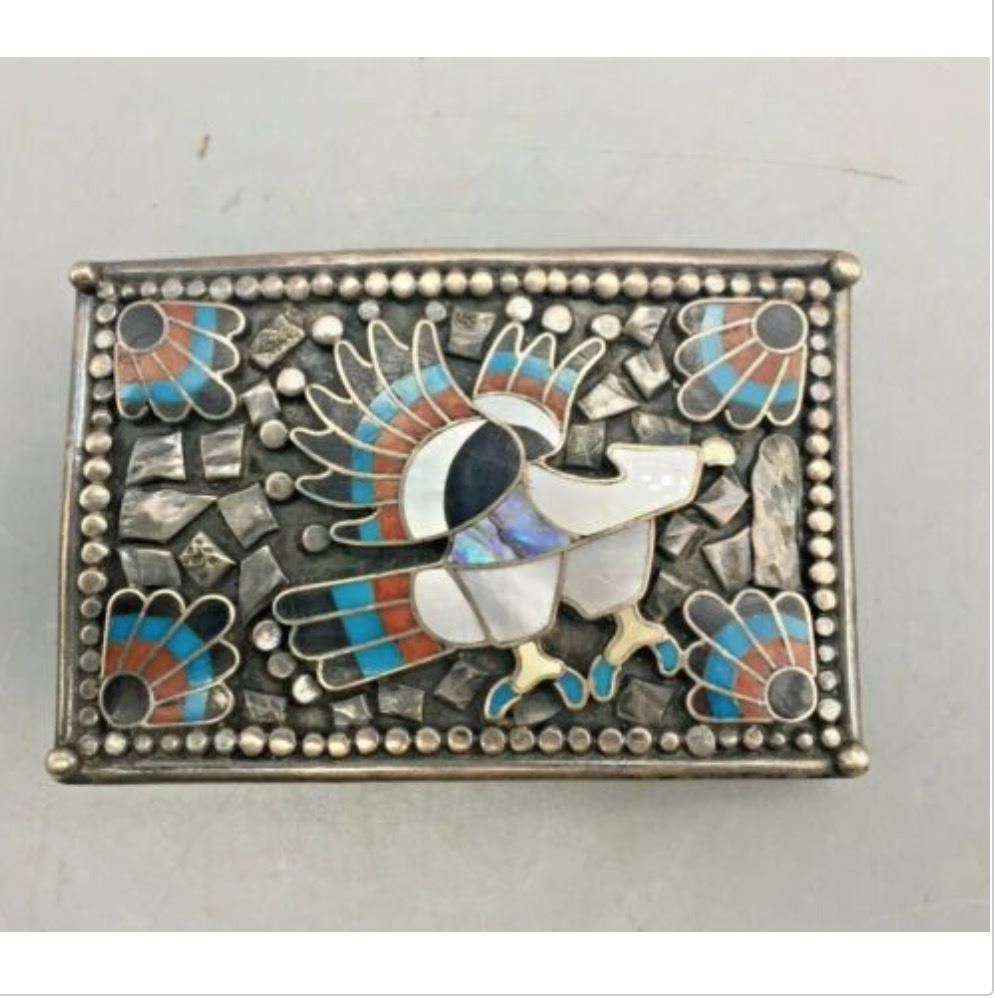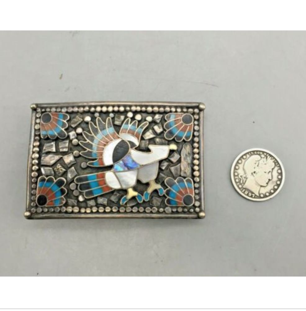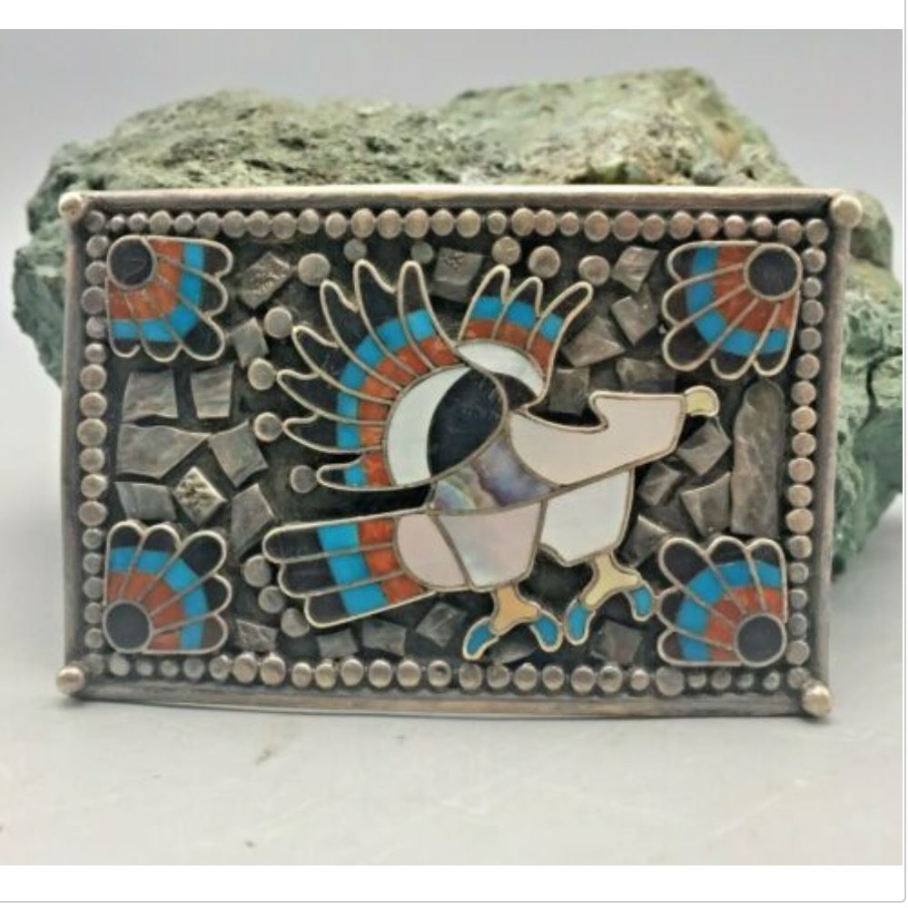 Description: Wow, this is bright, vibrant Zuni inlay belt buckle. This buckle has a beautiful eagle design along with other beautiful inlay work. It is set with turquoise, coral, onyx, mother of pearl and shell. It also features great silver texture work on the back ground. Marked Sterling and EB. Maker: Hallmarked EB, could be one of many Zuni artists. Approx. Age: Circa 1960s-1970s. Size: Measures 3" wide X 2" long. Fits up to a 1-1/2" belt. Weighs 54.1 g. Condition: Good for its age. Normal wear and minor imperfections expected on used and vintage items. Please look closely at the pictures as are an important part of our description. Shipping: There will be a $5 handling / packaging fee for shipping this lot. The actual cost of postage will be added on top of that. BUY IT NOW: If you would like to buy this item now without waiting for the auction to end (this option is only available up to 48 hours before the auction starts to close), the “Buy it Now” price is the high estimate of this lot. If you would like to end the auction early and pay the high estimate (plus applicable fees), please contact us by phone or email and reference this lot.