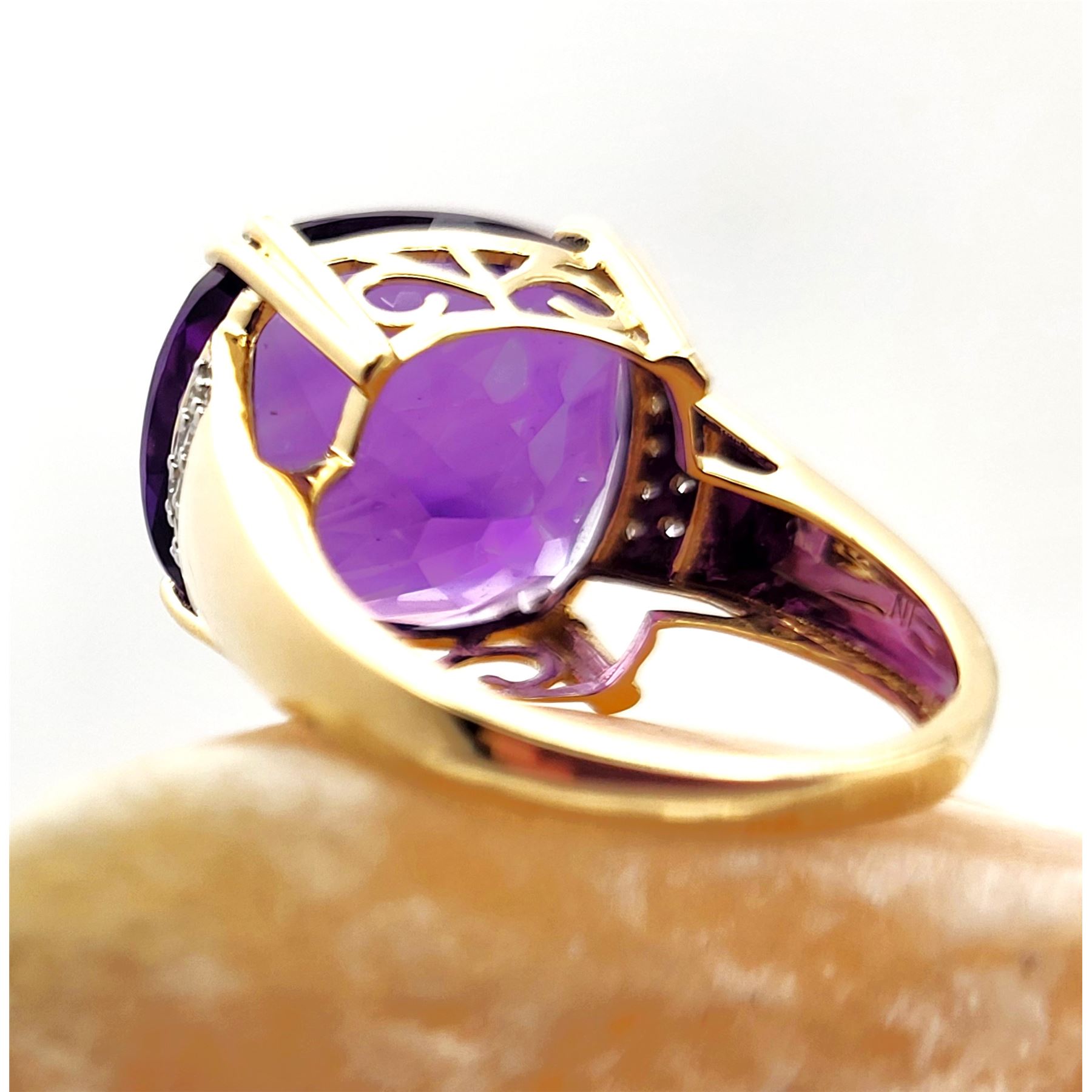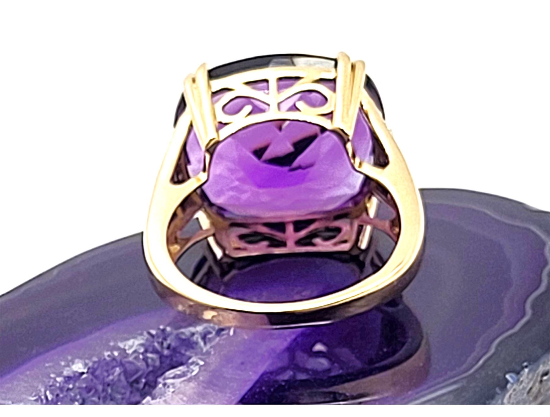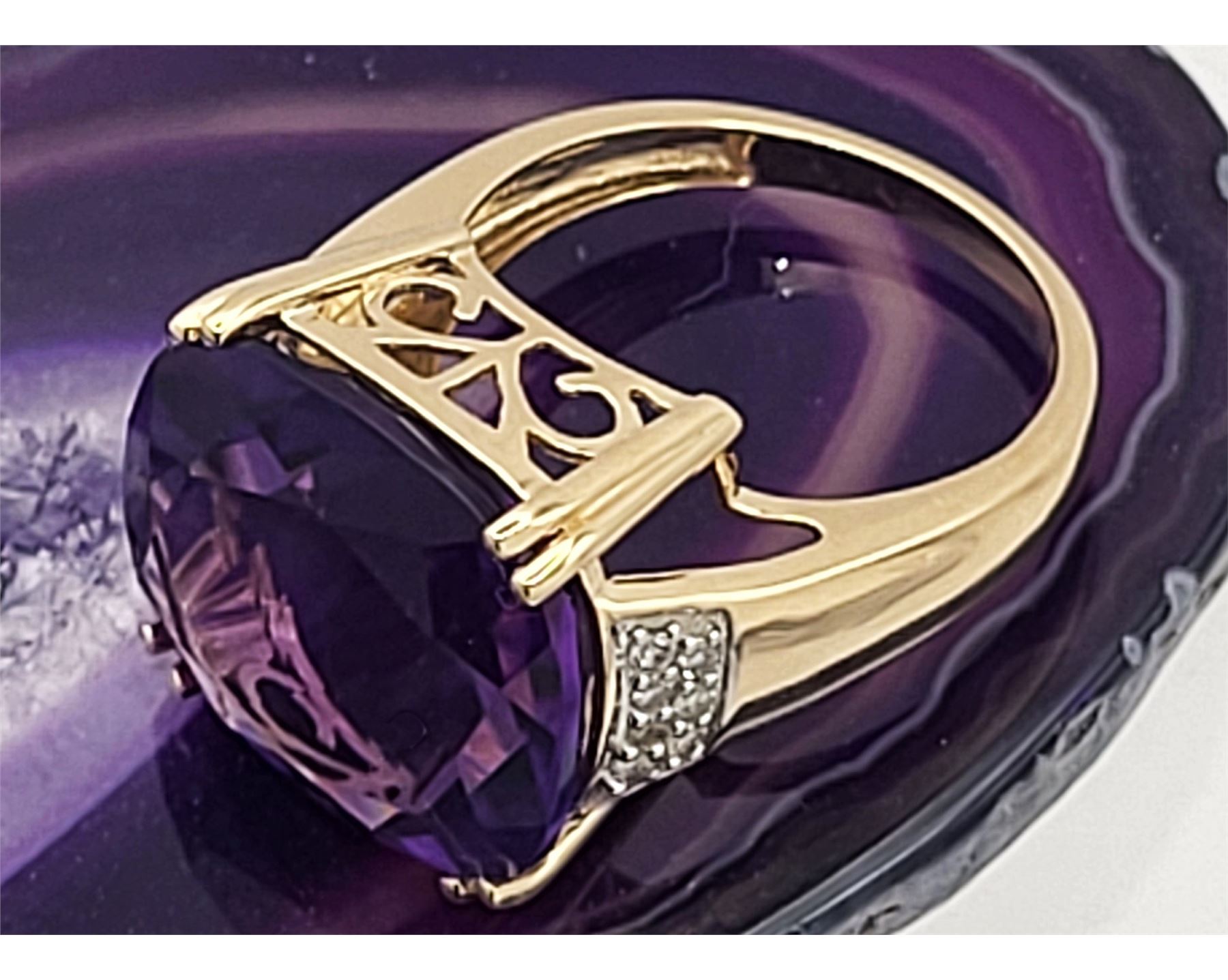 This 14 karat yellow gold ring features an impressive 11.25 carat, cushion-cut, natural amethyst that is set with alluring split prongs over a swirling, reticulated bridge. The wide cathedral shoulders have .17 carats total weight of micro-pave set, round, brilliant-cut, H-I color, I1 clarity diamonds. The ring is US size 7.& nbsp; See below for sizing options and other information.