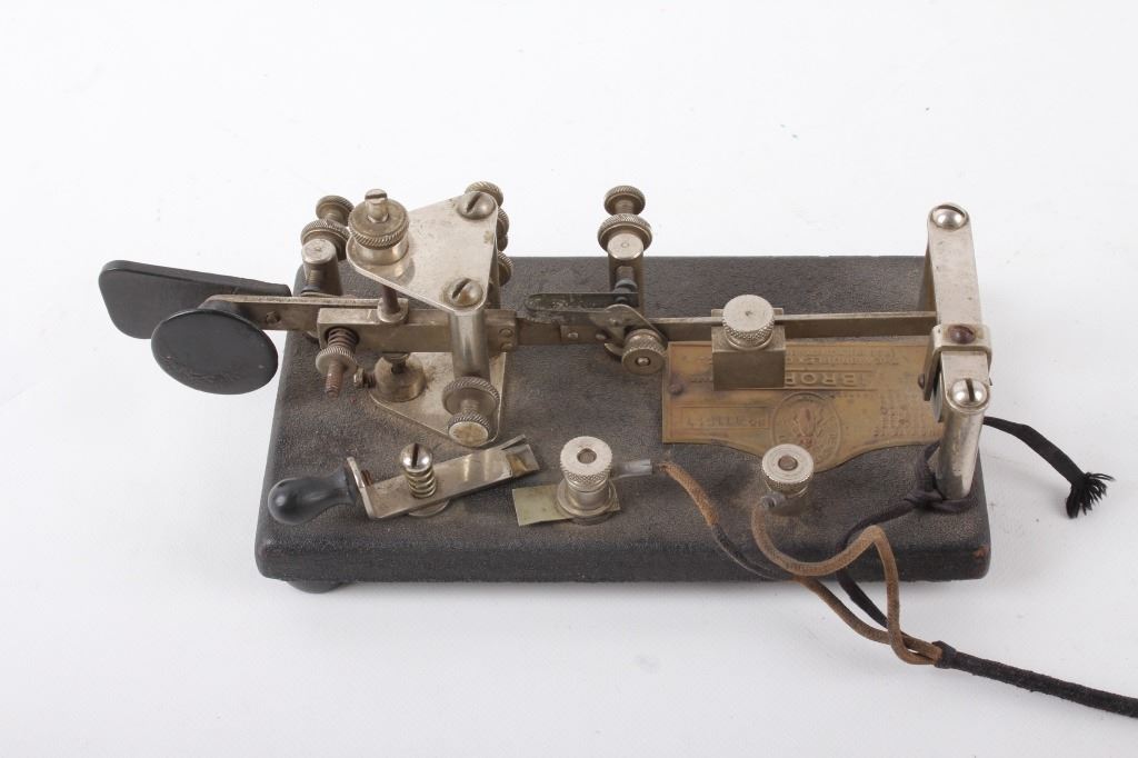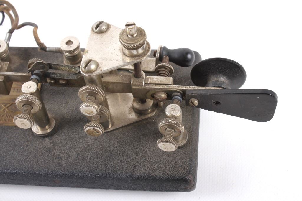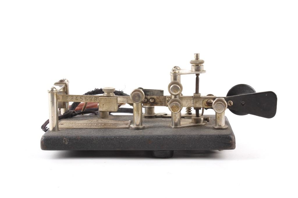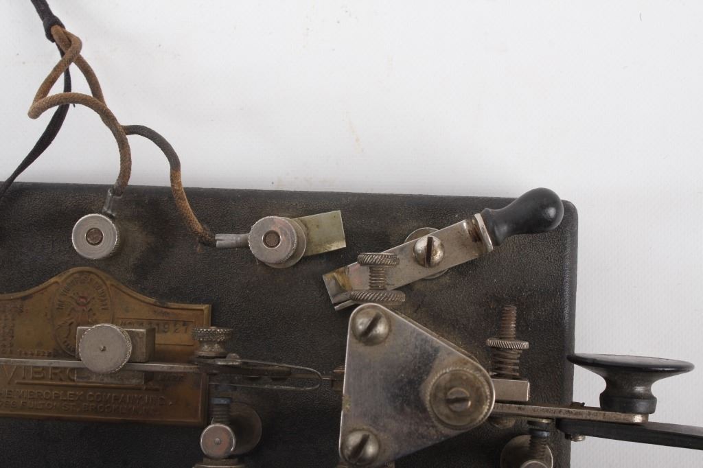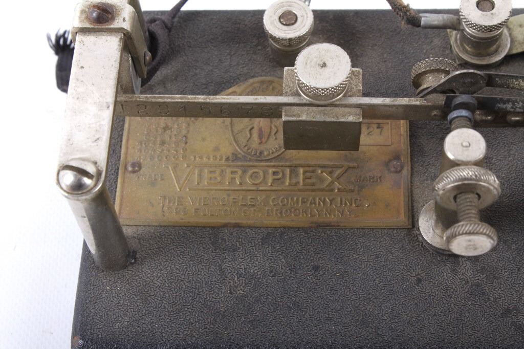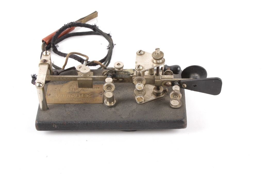 Included in this lot we have Vibroplex Telegraph key originating from the early 1900's. The Vibroplex company manufactured and patented the design for this semi-automatic morse key. The key shows a brass plaque across the top of the base reading "The Vibroplex company trade mark - trade Vibroplex mark - The Vibroplex Company. Inc. 796 Fulton St. Brooklyn. N.Y.". The piece is in good condition overall with some wear. The base measures 8" long by 3 1/2" wide.