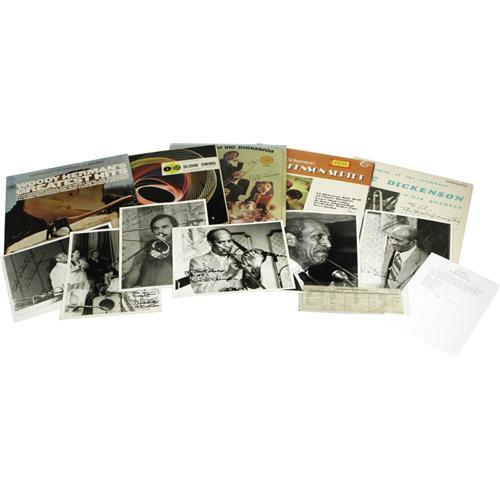 <B>Vic Dickenson and Woody Herman Signed Record and Photo Group.</B></I> This lot is a bonanza of Jazz autographs with Woody Herman, Vic Dickenson, Serge Chaloff, and Zoot Sims in the front line. This offering includes: "Woody Herman's Greatest Hits" (Columbia CS 9291) with a signed photo of Woody Herman; "Sliding' Swing - Vic Dickenson and Urbie Green" (Jazztone J1259) with its cover signed by Vic Dickenson (and two signed photos of Dickenson and Urbie Green); "The Essential Vic Dickenson" with its cover signed by Dickenson (and a signed photo of Dickenson); "Vic Dickenson Septet" ( Vanguard VRS 8520/1) with its cover signed by Dickenson and Ruby Braff (and a signed photo of Dickenson, and a 194 collection of Jazz autographs, including Woody Herman, Serge Chaloff, Zoot Sims, Ernie Royal, Mary Ann McCall, Don Lamond, Earl Swope, and Ollie Wilson); and "Vic Dickenson Quartet" (Mahogany 558 105) with its cover signed by Dickenson (with a photo signed by Dickenson). <I>Accompanied by LOA from PSA/DNA. From the Al White Jazz autograph archive. </B></I><BR><BR><b>Shipping:</b> Other (oversized items, group lo (<a target="_blank" href="http://www.heritageauctions.com/common/shipping.php">view shipping information</a>)