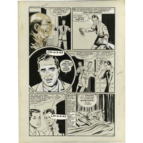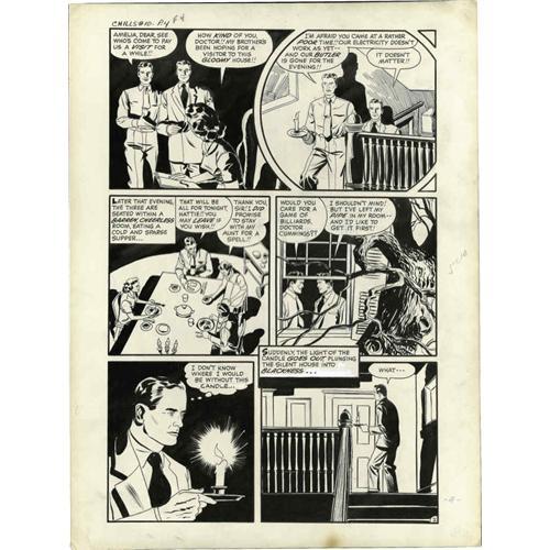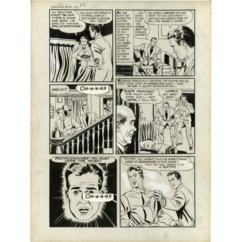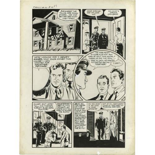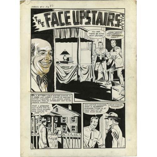 <B>Vic Donahue - Chamber of Chills #10 Complete 8-page Story "The Face Upstair" Original Art (Harvey, 1952).</B></I> The terror, the sheer terror -- of the Comic Code Authority's story corrections will haunt any Harvey horror fan! This eight page chiller first appeared as "The Face of Horror" in <B>Chamber of Chills</B></I> #10, but it must have been slated as a reprint elsewhere, due to the many Code-directed changes. The first thing to go was the word "horror" in the story title. Then, the gruesome, twisted face was art-corrected in each panel to a pleasant, smiling face. After a few more plot and dialogue changes, this yarn begins to take on a new reality in an alternate universe. You have just entered the Silver Age zone! The image area of each page measures 12" x 18". Aside from the code-mandated changes, the art is in Good condition.
