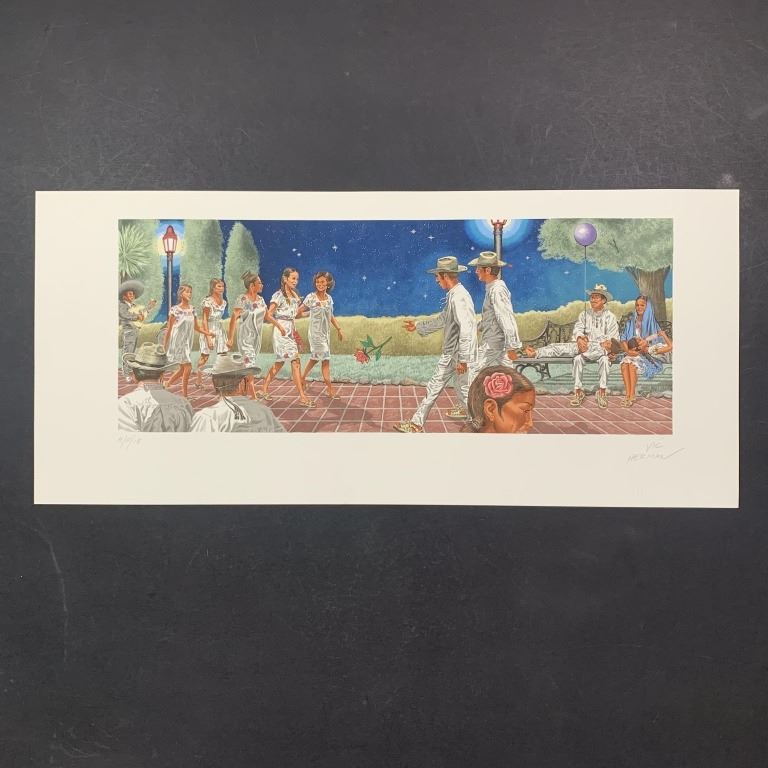 Vic Herman's "A Rose to my Precious" limited edition print, signed lower right, and numbered AP 18 lower left. This piece is of two men walking towards a group of women, and one man is dropping a rose for one of the women to pick up. This piece is in excellent condition.