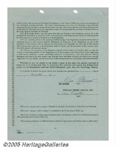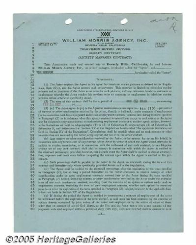 <B>Vic Morrow Signed Contract.</B></I> A double-sided, three-page television and motion picture contract between actor Vic Morrow, best remembered for his roles in the TV series "Combat!" and the movie "The Blackboard Jungle," and the William Morris Agency for a one year term, with the agency receiving ten percent. Signed on the reverse of the last page in black ink by Morrow. In fine condition, with binder holes to top edge as well as staples and holes to the top left corner. <I>With COA from PSA/DNA.</B></I>