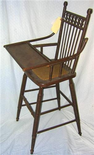 True Victorian era child's oak high chair. Solid oak. Excellent condition w/ cane seat, spindle back. Turned legs, magnificent condition & craftsmanship. 40"tx16.5"w. 10lbs (5-19)