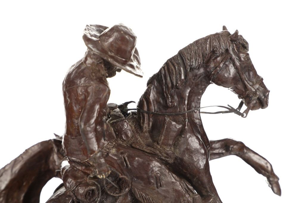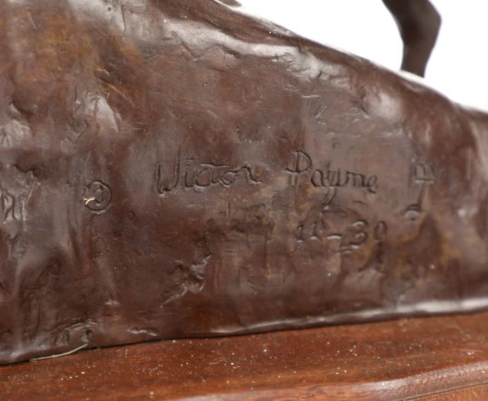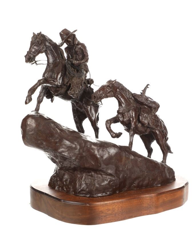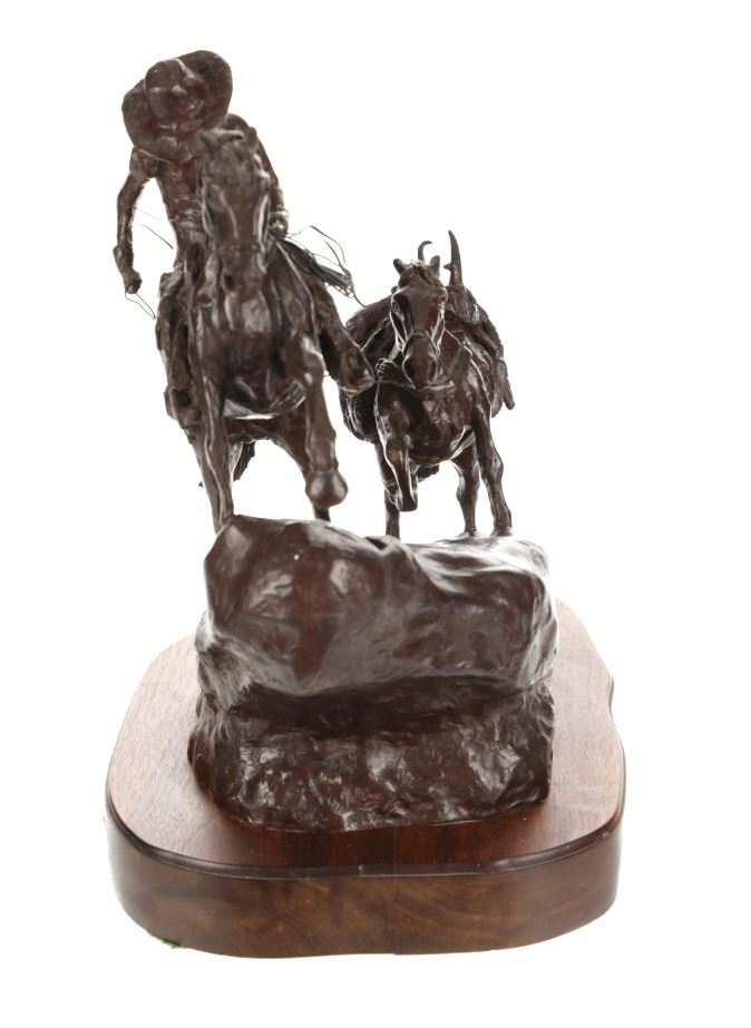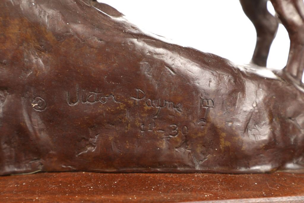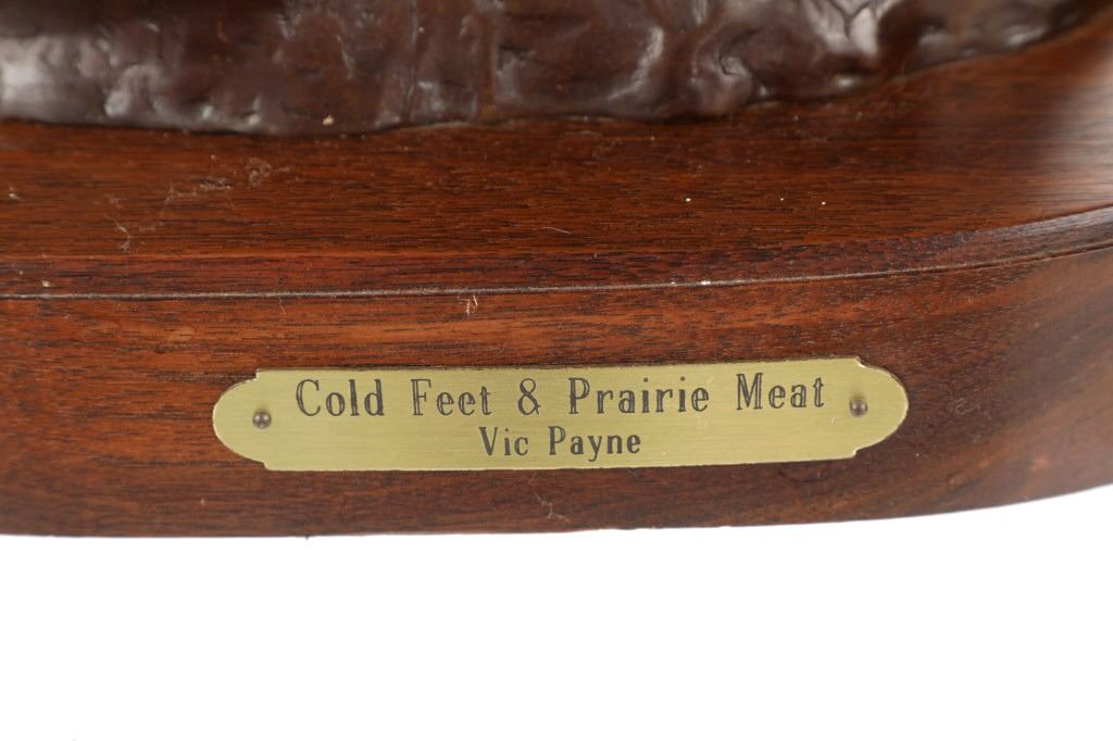 Featured in this lot is this bronze sculpture by Wyoming artist Vic Payne (born in 1960) and titled "Cold Feet and Prairie Meat”. The sculpture shows a professionally sculpted scene of a western cowboy leading a pack horse with a fresh kill of pronghorn. The sculpture shows amazing attention to detail as the trio ride up hill. Vic Payne, born in 1960, has been sculpting for over 35 years. When he moved to a ranch in New Mexico, the western roots became central in the shaping of this sculptor's character. Vic's distinctive style and artistic approach to sculpting, along with his attention to detail, is widely recognized as being imaginative and innovative, chronicling the life and era of our nation's history. Over the past 23 years, Vic has been commissioned to sculpt numerous monumental bronze sculptures for corporations, municipalities, and individuals. For example, he was commissioned by Cabela's; Vic had the honor to sculpt several monumental bronze sculptures for their stores in Pennsylvania. The condition of this bronze is good, with no obvious signs of damage. The measurements of this bronze are 15" x 14 1/2" x 8 1/2". Provenance: This is from the personal Artist Margie Jackson.