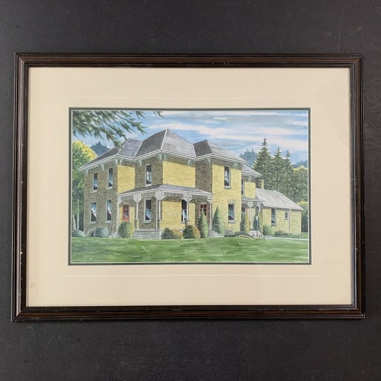 Vic Roschkov's "Family Home" print. This piece is of a yellow family home, in the middle of spring/summer, with luscious green grass and plants. This piece has been custom framed under glass.