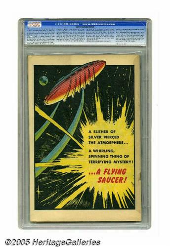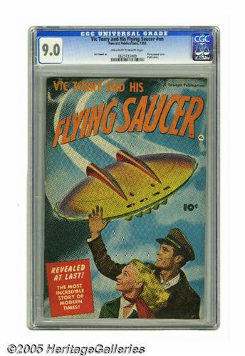 <B>Vic Torry & His Flying Saucer #nn (Fawcett, 1950) CGC VF/NM 9.0 Off-white to white pages.</B></I> This UFO-themed one-shot has a colorized photo cover as well as book-length Bob Powell interior art. Overstreet 2005 VF/NM 9.0 value = $647; NM- 9.2 value = $875. CGC census 7/05: 1 in 9.0, 1 higher.