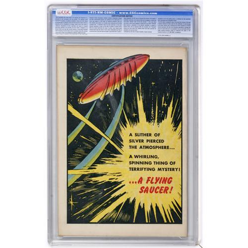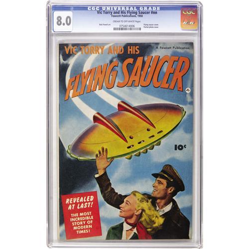 <B>Vic Torry & His Flying Saucer #nn (Fawcett, 1950) CGC VF 8.0 Cream to off-white pages.</B></I> Unusual for its cover (part photo, part painted) and for its format (full-length story), the issue featured artwork by Bob Powell. Overstreet 2006 VF 8.0 value = $419. CGC census 3/07: 4 in 8.0, 5 higher.<BR><BR><b>Shipping:</b> Comics - Slabbed (certified) (<a target="_blank" href="http://www.heritageauctions.com/common/shipping.php">view shipping information</a>)