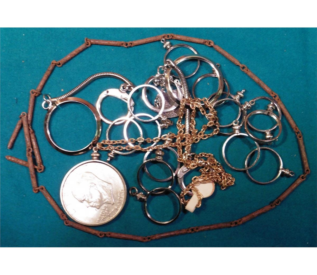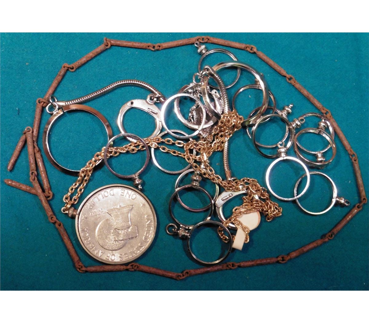 “Vica” Key Ring; (2) Split Key Rings (Half-dollar?) no coin; 1776-1976 Eisenhower Dollar in a Bezel with gold-plated chain; Antique iron link chain (broken); & (14) Nickel Bezels.