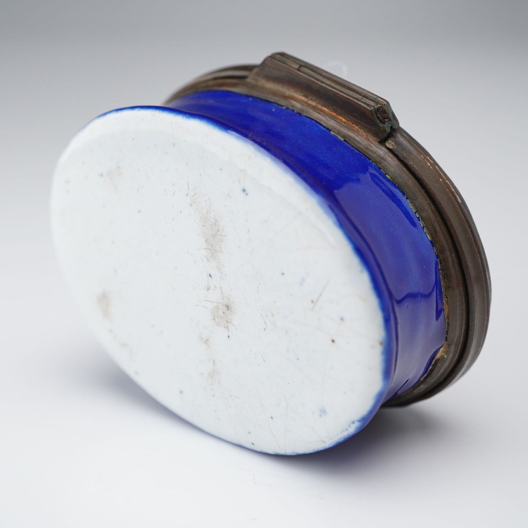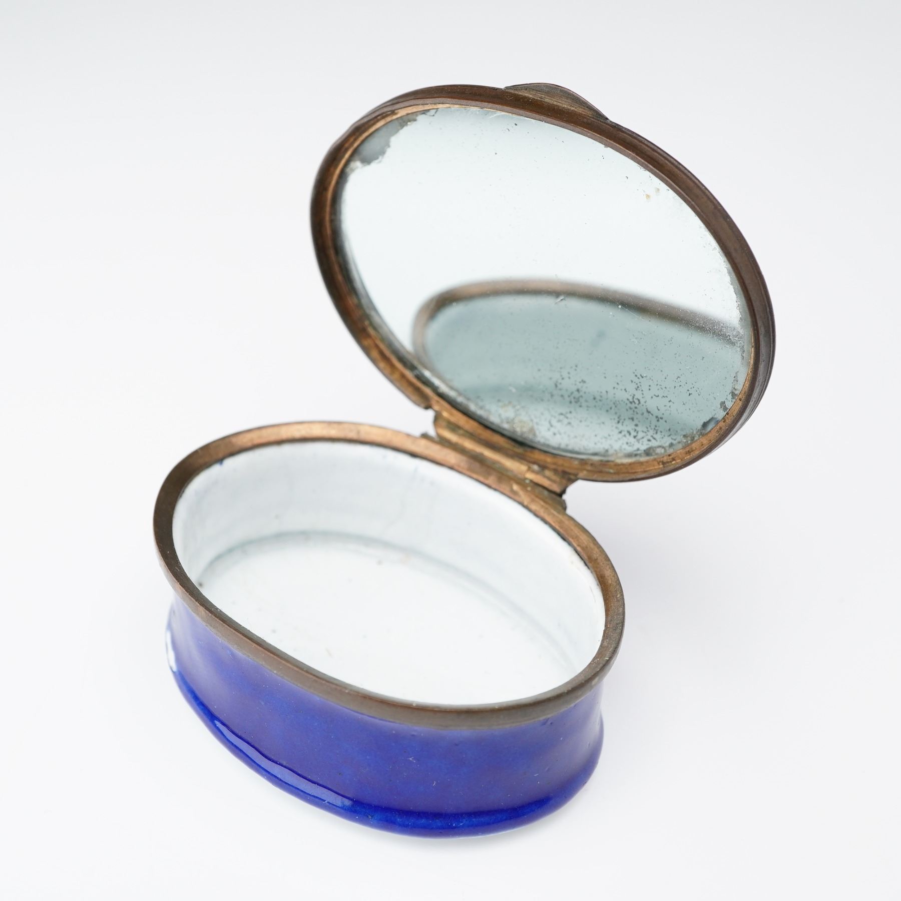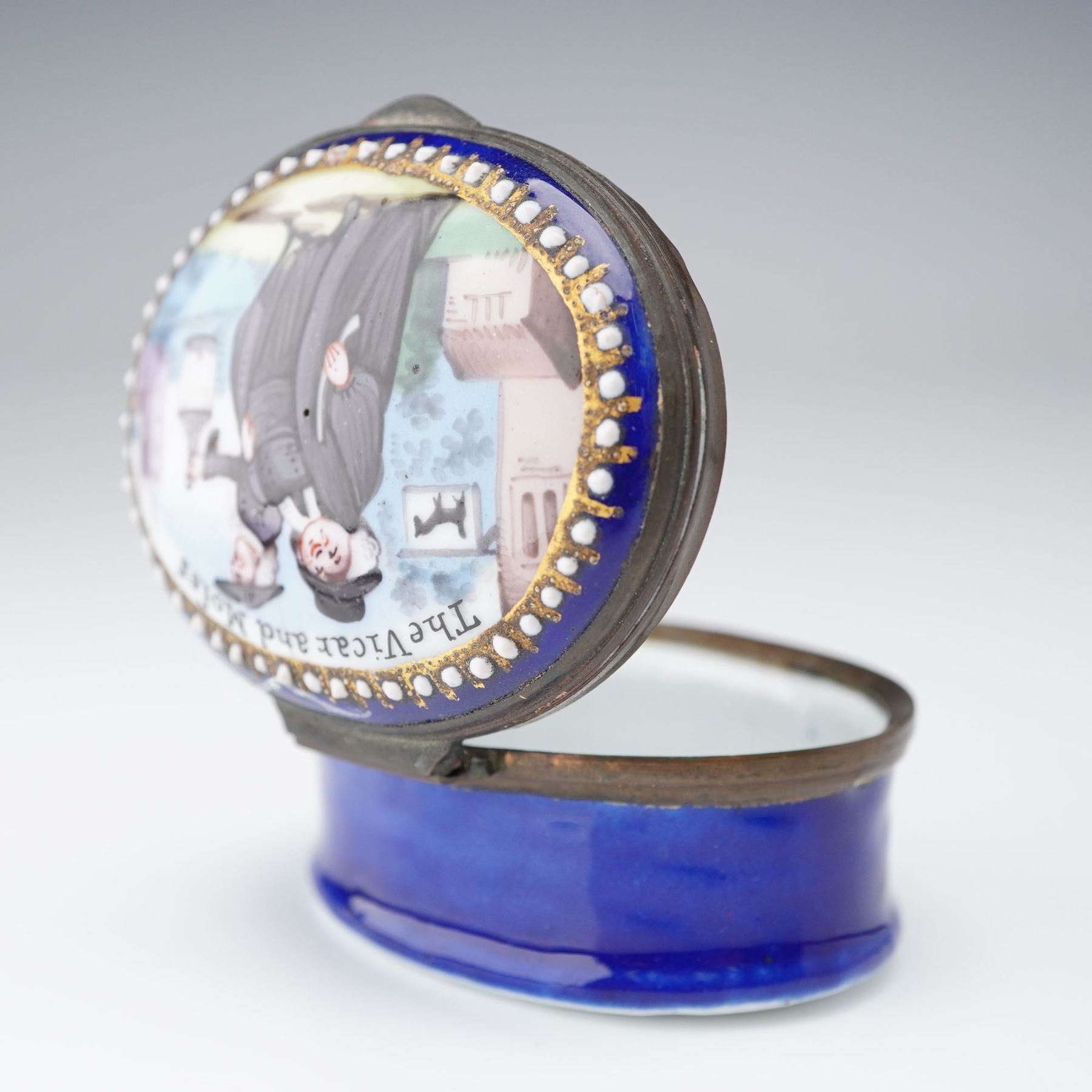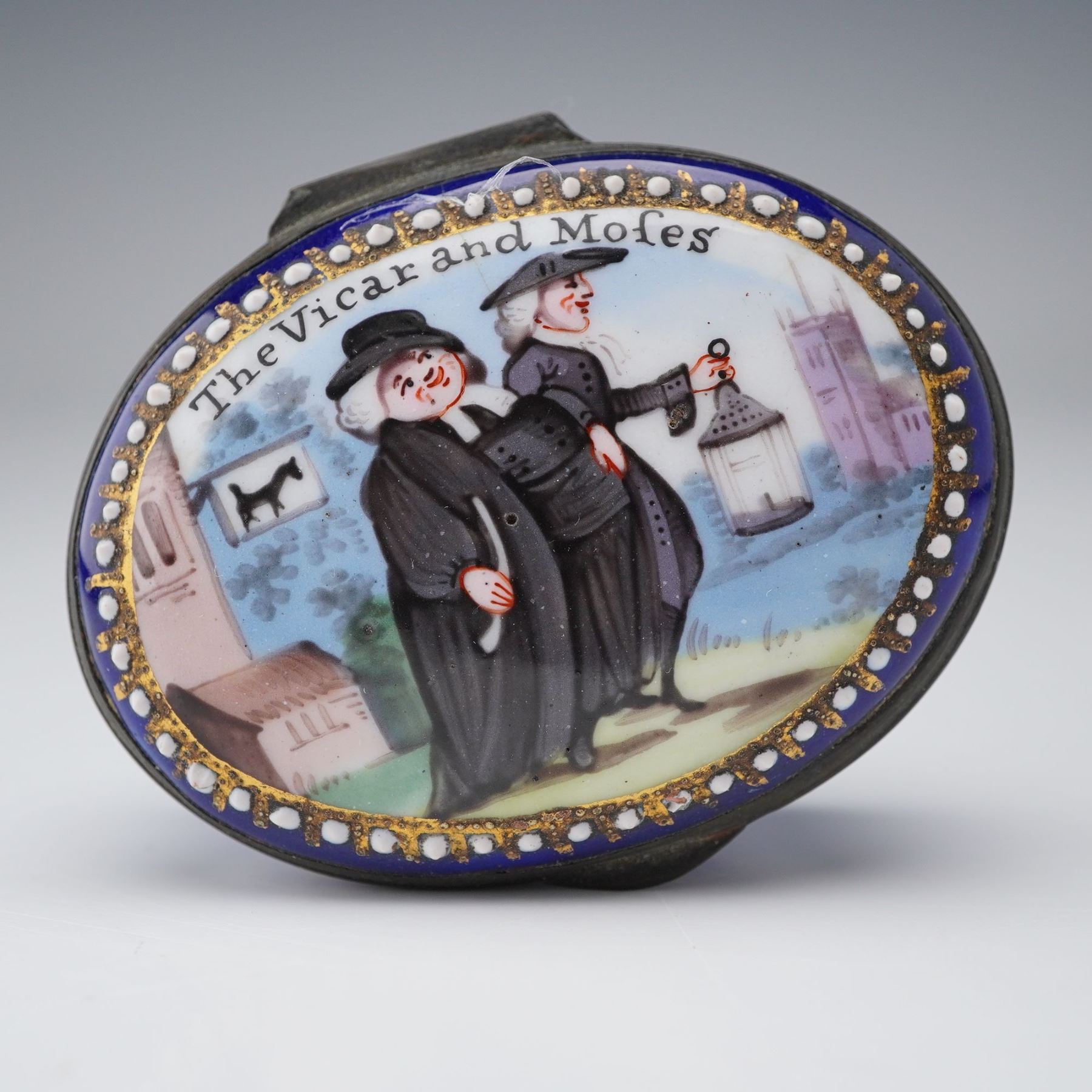 This charming lidded ring box features a colorful enamel illustration titled The Vicar and Moses. It depicts two figures in traditional attire with a lantern, set against a pastoral background. The box is finished with a border of gold and white enamel detailing. The inside is lined with a clean, smooth surface.