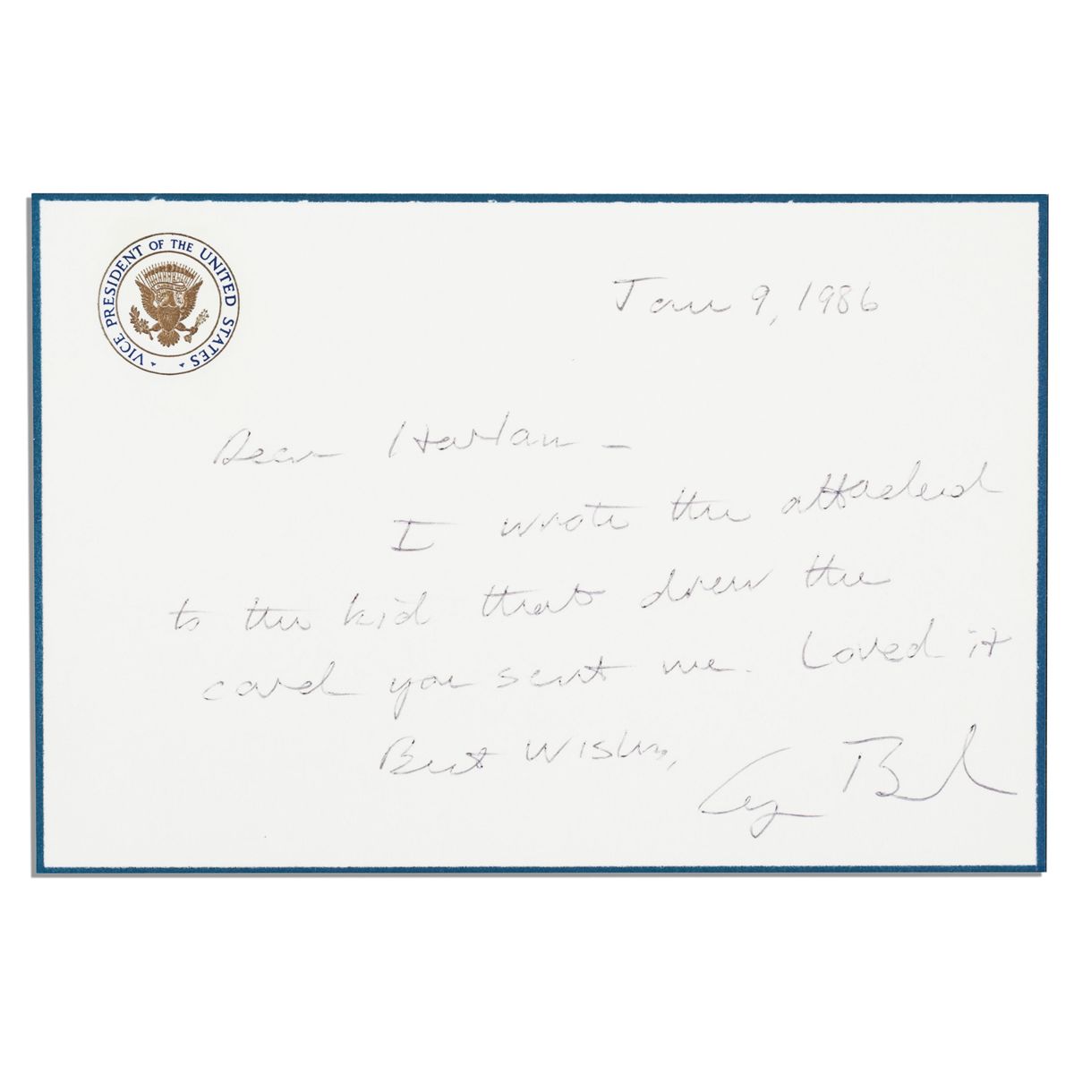 George H.W. Bush autograph note signed on Vice President note card. Dated 9 January 1986, note reads in full, ''Dear Harlan - I wrote the attached to the kid that drew the card you sent me. Loved it. Best wishes, George Bush''. Measures 6.5'' x 4.25''. Slight toning and fading, else fine.