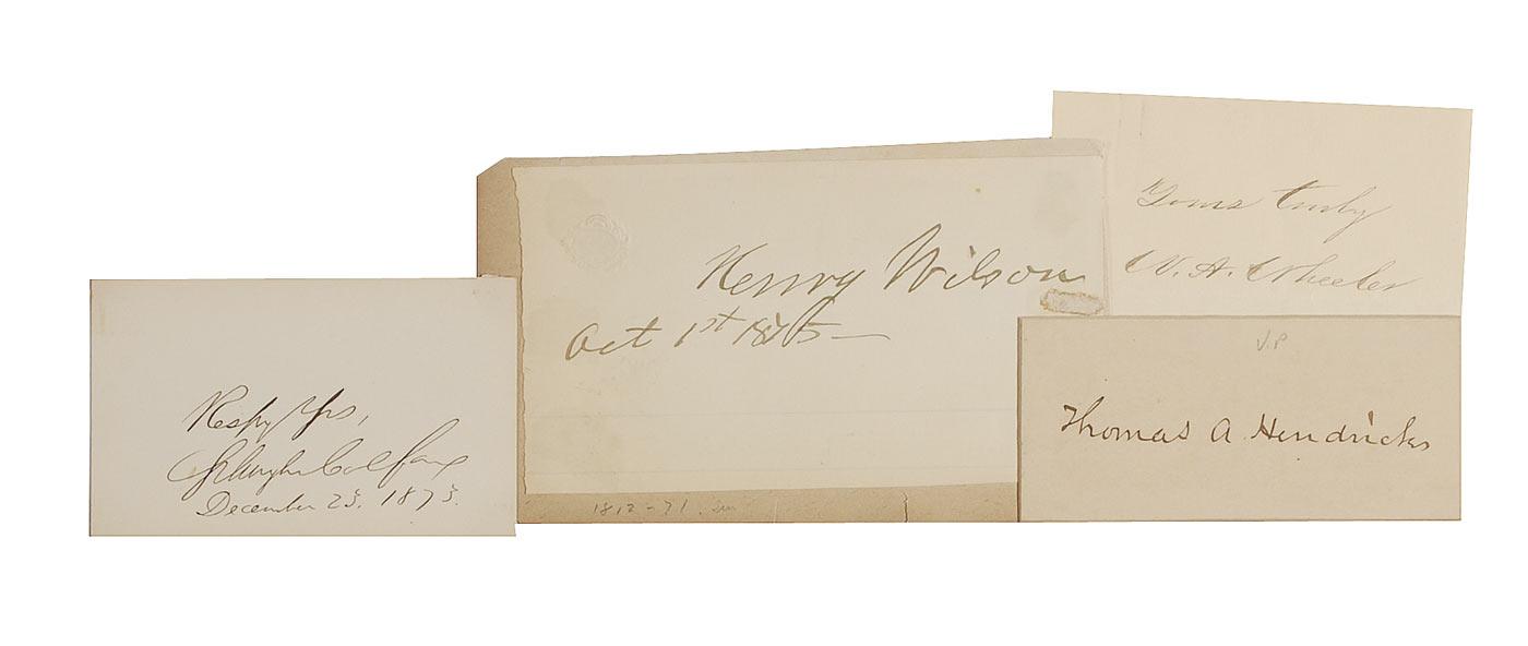 Ink signatures of Schuyler Colfax, Thomas A. Hendricks, William A. Wheeler (signed “W. A. Wheeler”), and Henry Wilson on individual cards or slips cut from a larger page. Most have added a brief sentiment or date. In overall very good condition.