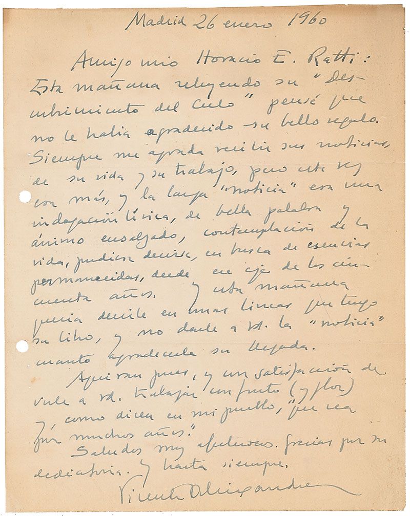 Spanish poet (1898–1984) awarded the Nobel Prize for Literature in 1977. ALS in Spanish, one onionskin page, 8.5 x 10.5, Madrid, January 26, 1960. Scarce untranslated letter to fellow writer Horacio E. Ratti. In fine condition, with two punch holes to left border and toning to top edge.