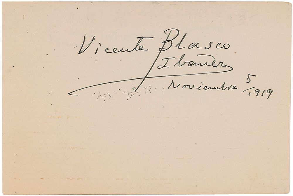 Spanish writer and politician (1867–1928) who achieved renown for his novels dealing with WWI, the most famous of which is The Four Horsemen of the Apocalypse. Vintage ink signature, “Vicente Blasco Ibanez, Noviembre 5, 1919,” on an off-white 5.25 x 3.5 album page. In fine condition, with light overall toning and a few scattered ink spots.
