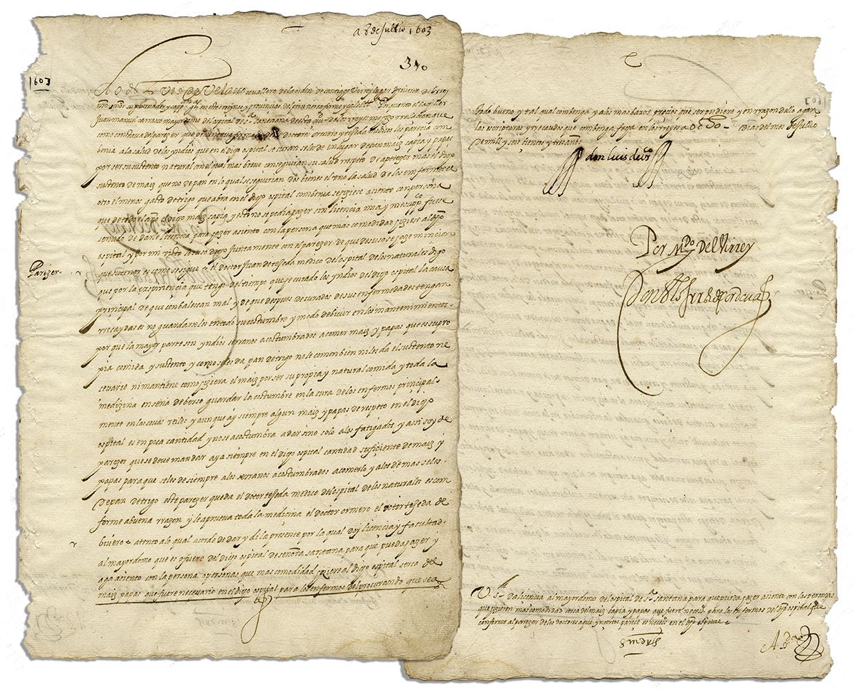 Viceroy of Peru, Don Luis de Velasco document signed, dated 18 July 1603. Amid the Spanish colonization of the Americas, Don Luis de Velasco served as the second Viceroy of New Spain. Written in Spanish, document orders the Viceroy to provide corn and potatoes to hospitals to feed the native Indians. On two pages, document measures approximately 8.5'' x 12''. Very good condition.