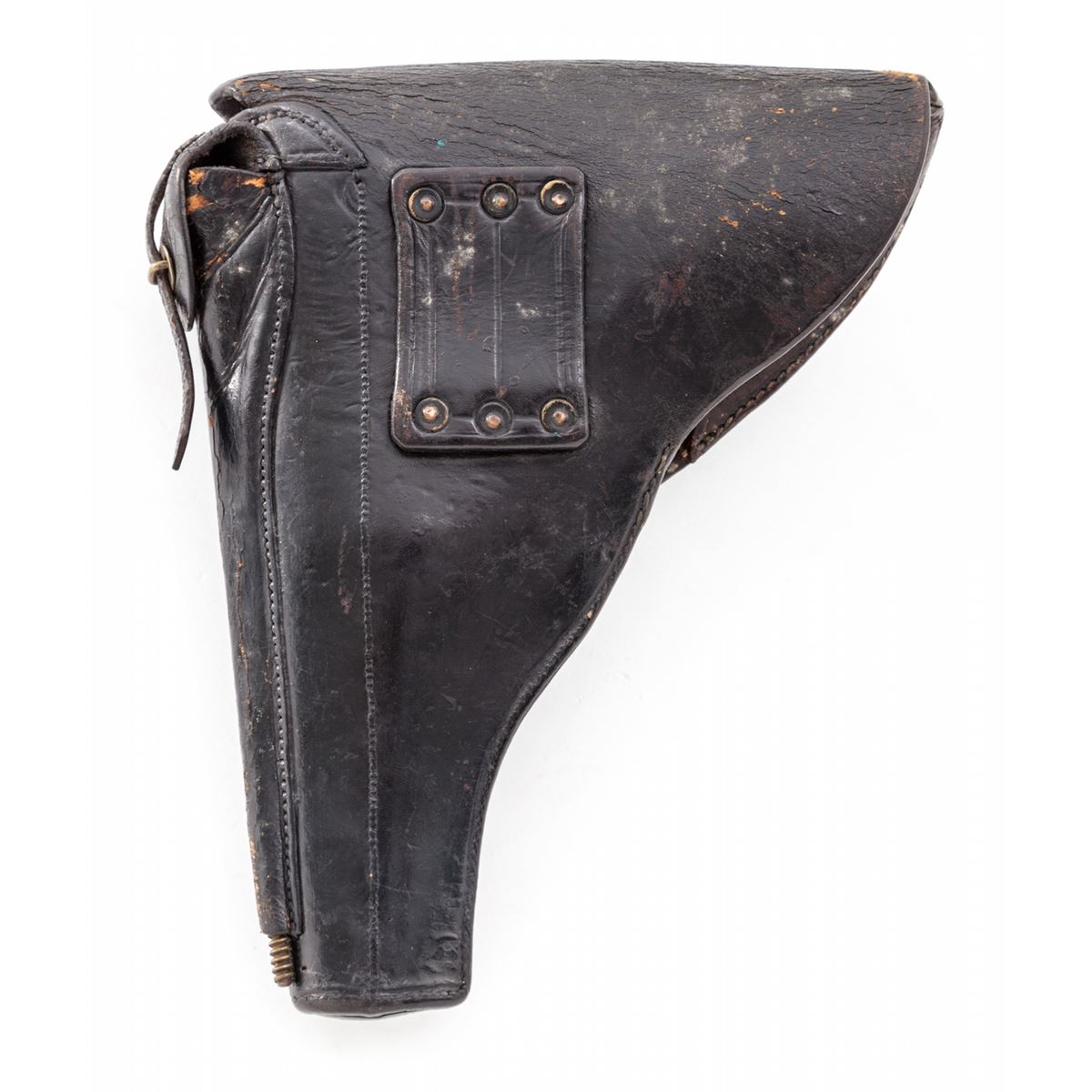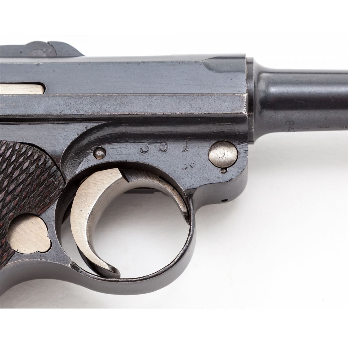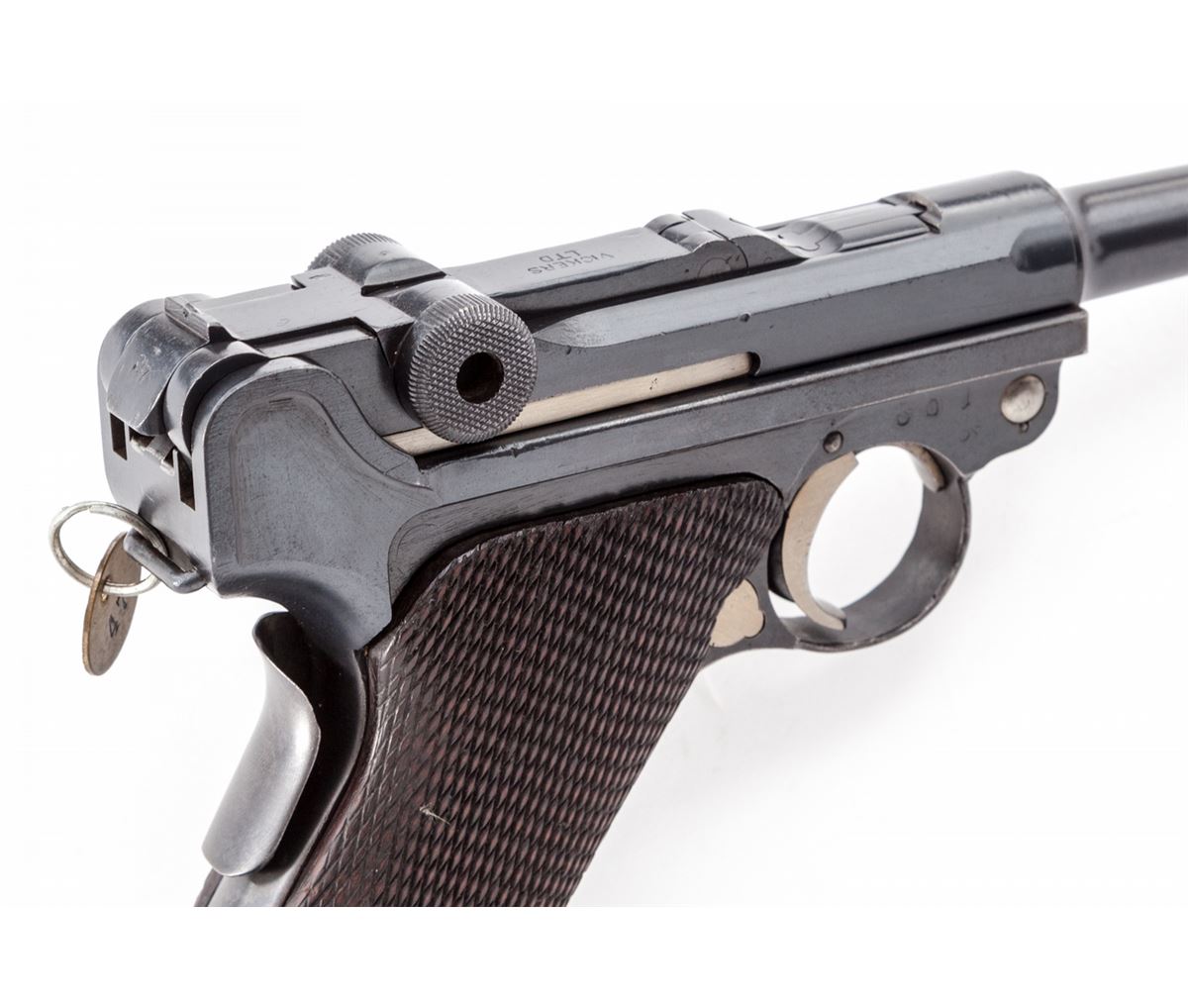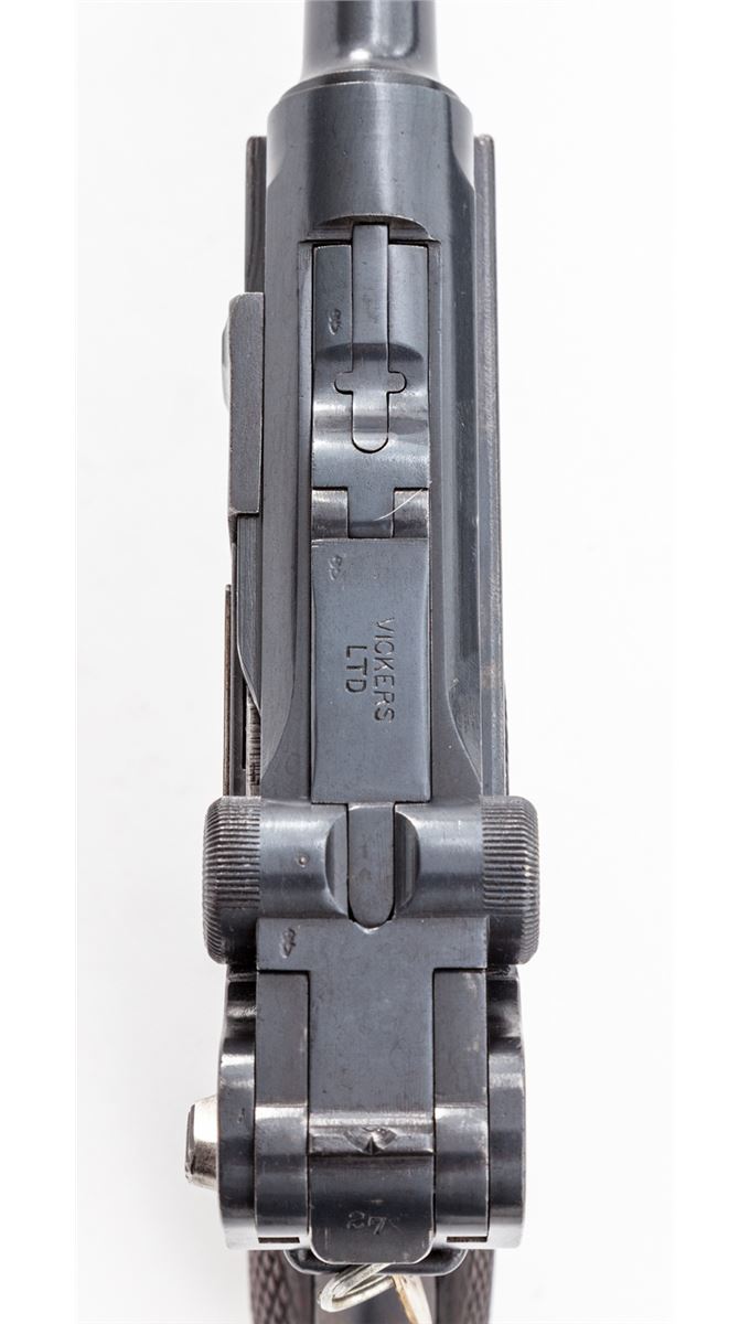 Vicker's Ltd. Dutch Luger, #8427, 9mm, 4'' barrel, blue finish with straw small parts, correct coarse checkered walnut grips, with one unmarked tin-plated wood based magazine with retaining tab instead of cross pin at base. Soldered brass plate to left side receiver flat marked ''Mgd. WI./7''. Blank chamber, Vicker's Ltd. marked toggle link, thumb safety marked ''Rust'' with upward pointing arrow, Dutch Royal proofmarks, and British proofmarks to bottom of barrel. In correct Dutch holster with combination cleaning rod/oiler. Condition is excellent retaining approx. 97% thinning arsenal blue. Straw components show light thinning and may have been restrawed at time of overhaul. Dutch grips with coarse flat checkering, show little wear and some oil darkening. Action is good, bore is fine. All visible matching numbers. Holster shows some loss of finish near fold area of both main flap and cleaning rod flap, with light scuffs and impressions. A nice early Vickers rig. Est.: $3,000-$5,000. (C&R/PPT) (John Siroonian estate)