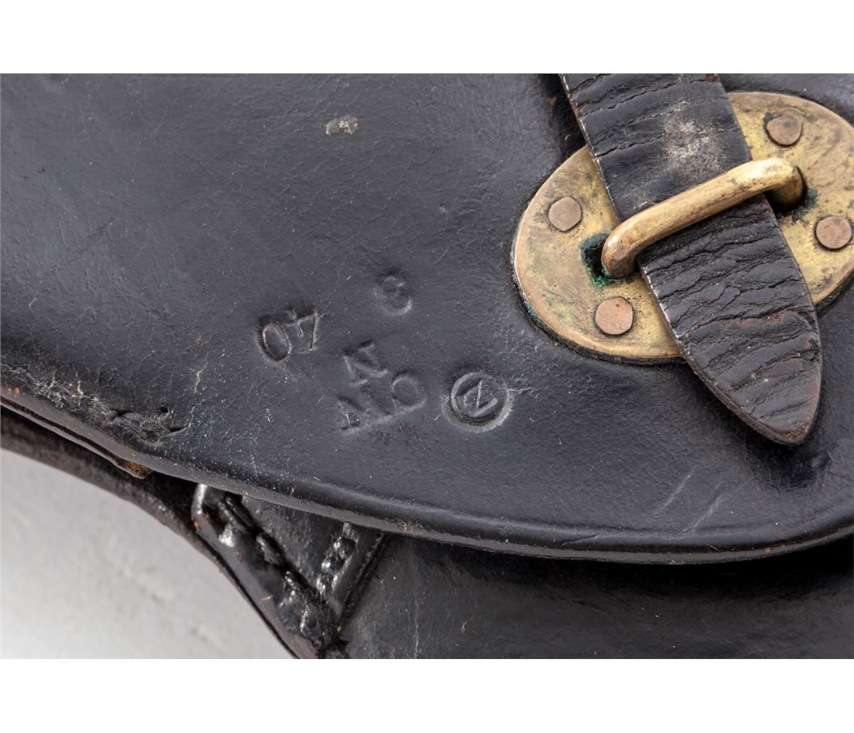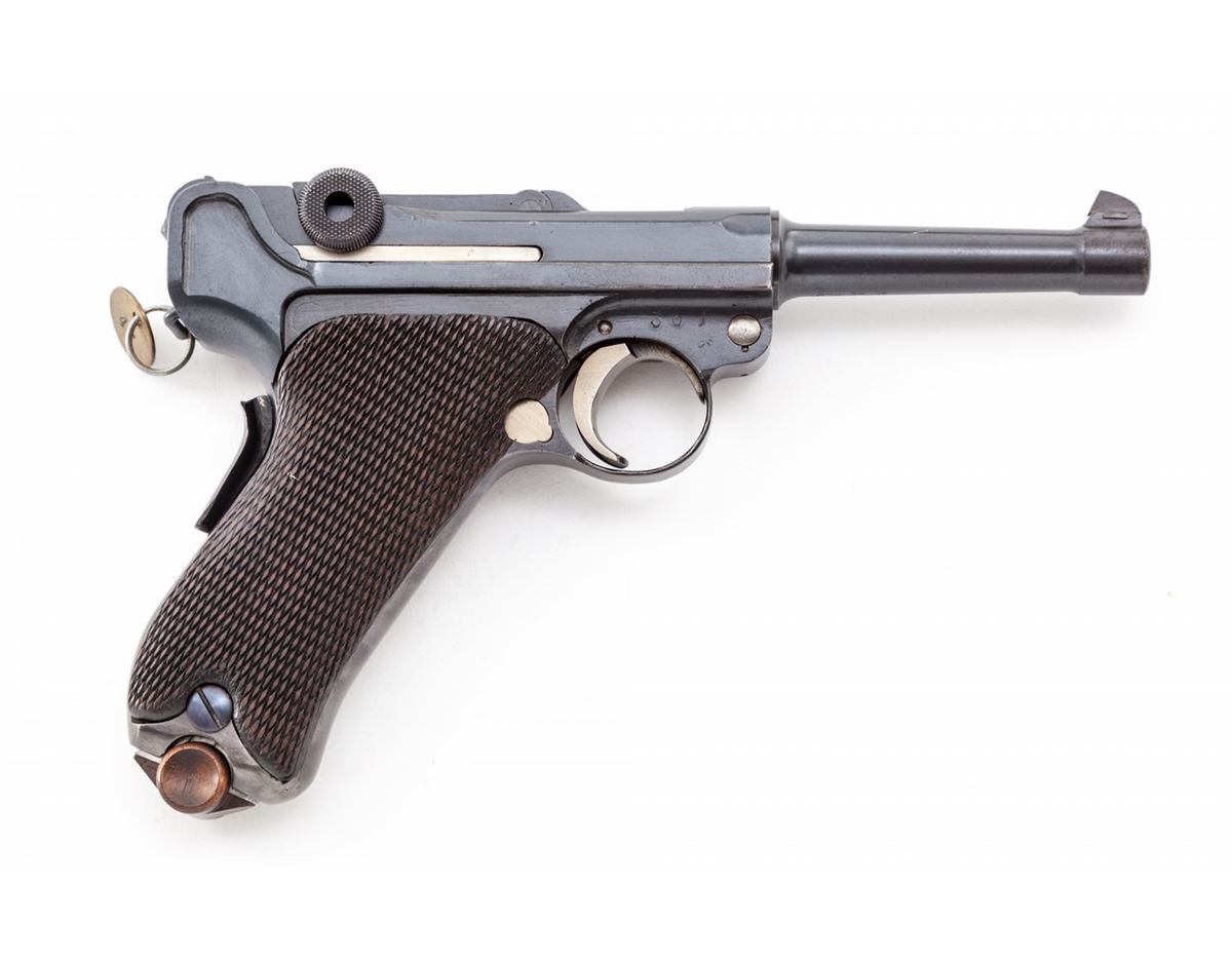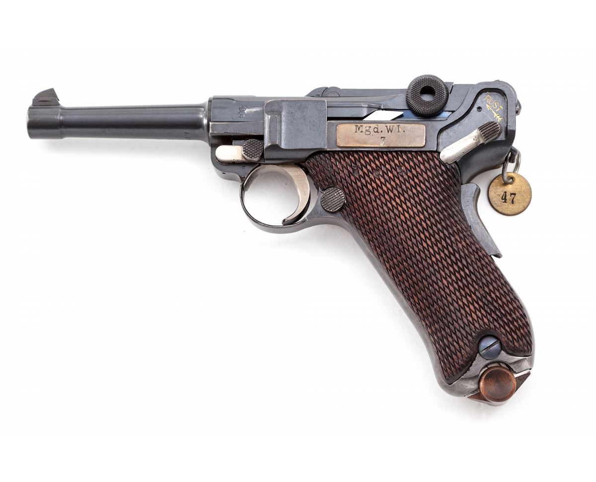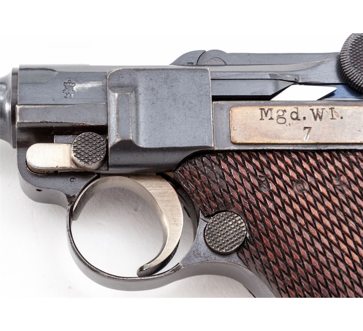 Vicker's Ltd. Dutch Luger, #8427, 9mm, 4'' barrel, blue finish with straw small parts, correct coarse checkered walnut grips, with one unmarked tin-plated wood based magazine with retaining tab instead of cross pin at base. Soldered brass plate to left side receiver flat marked ''Mgd. WI./7''. Blank chamber, Vicker's Ltd. marked toggle link, thumb safety marked ''Rust'' with upward pointing arrow, Dutch Royal proofmarks, and British proofmarks to bottom of barrel. In correct Dutch holster with combination cleaning rod/oiler. Condition is excellent retaining approx. 97% thinning arsenal blue. Straw components show light thinning and may have been restrawed at time of overhaul. Dutch grips with coarse flat checkering, show little wear and some oil darkening. Action is good, bore is fine. All visible matching numbers. Holster shows some loss of finish near fold area of both main flap and cleaning rod flap, with light scuffs and impressions. A nice early Vickers rig. Est.: $3,000-$5,000. (C&R/PPT) (John Siroonian estate)