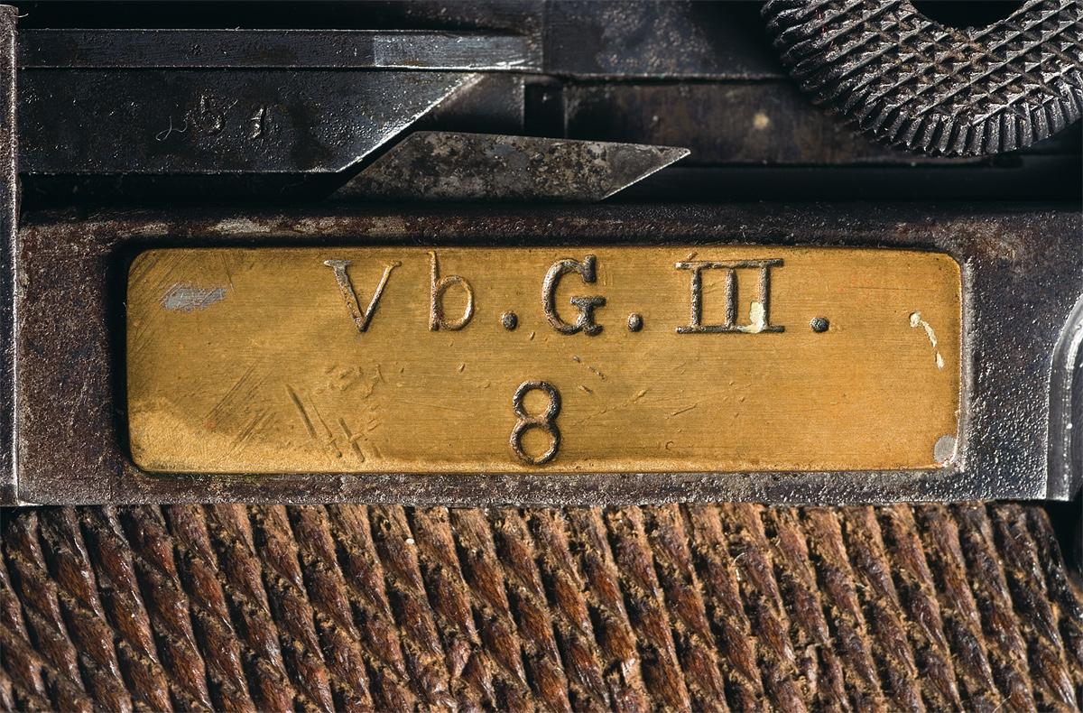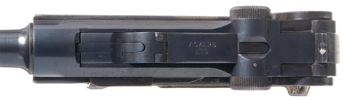 Operating under the Vickers Limited name from 1911 to 1929, this pistol was produced by the firm on contract with the Dutch. Fixed sights, with the chamber blank and the front toggle link marked "VICKERS/LTD". The "crown/ W" mark of Queen Wilhelmina is present on the left side of the extension, with London proofs on the barrel, breechblock and toggle links, "GELADEN and "RUST" markings on the extractor and safety area. A brass plaque marked "Vb.G.III./ 8" has been added to the left side of the frame. Matching numbers on the barrel and frame, and matching partial numbers on the lever, side plate, trigger, sear, toggle pin, toggle links, and breechblock. Checkered grips and nickel finished magazine with wood base.