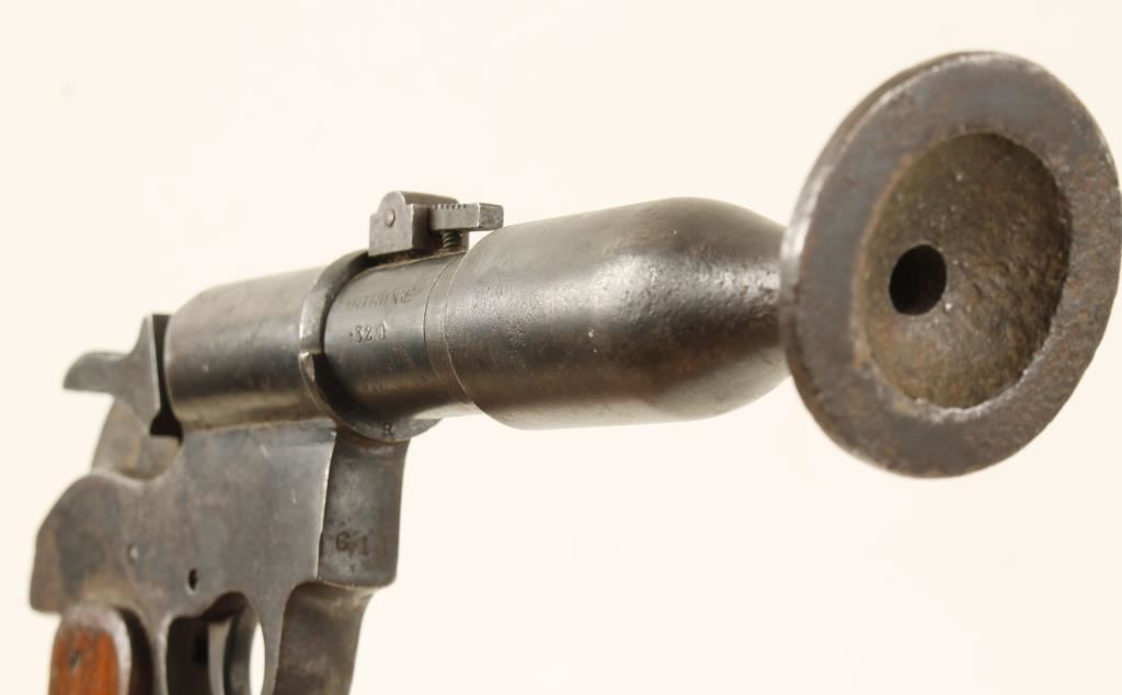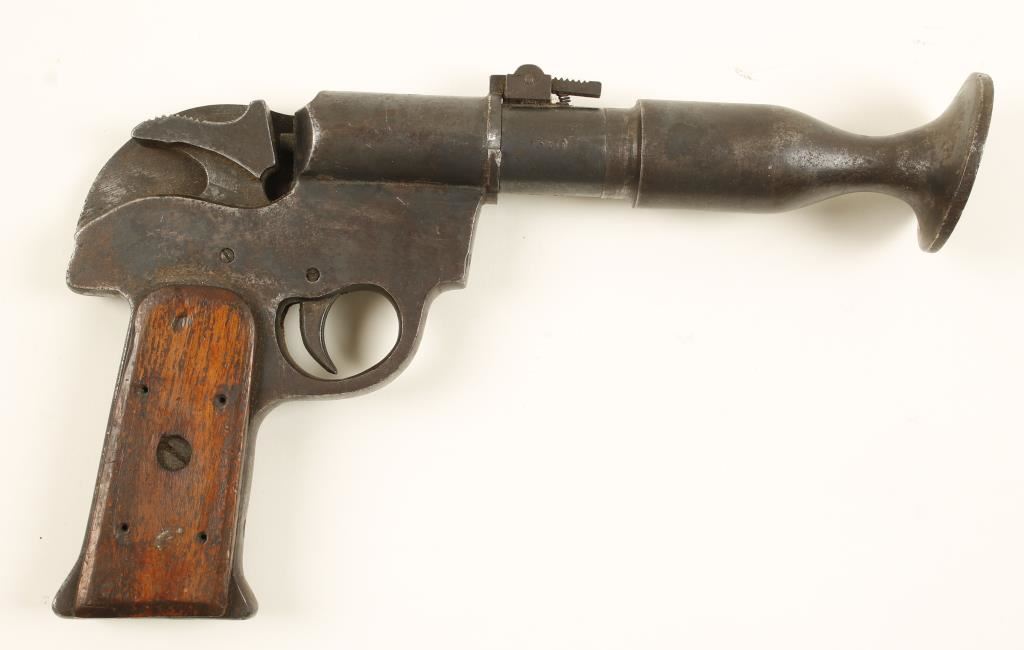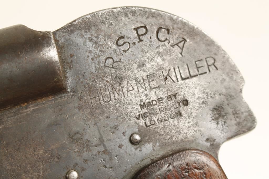 Blued single-shot pistol for dispatching livestock. Stamped "R.S.P.C.A." for the Royal Society for the Prevention of Cruelty to Animals. Bluing has faded to a brown patina with exposed areas worn through to bare metal. There are many dings and scratches. Wood grips also have dings and scratches. Bore is bright and shiny with some rust. Action works. Condition is good. *Antique Firearm*