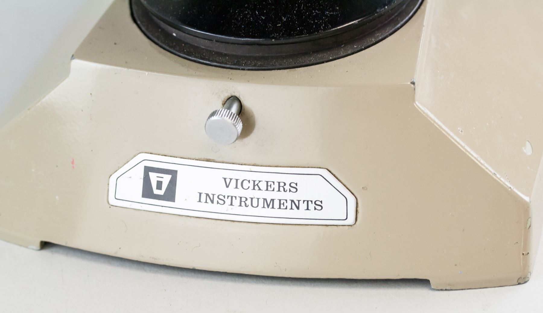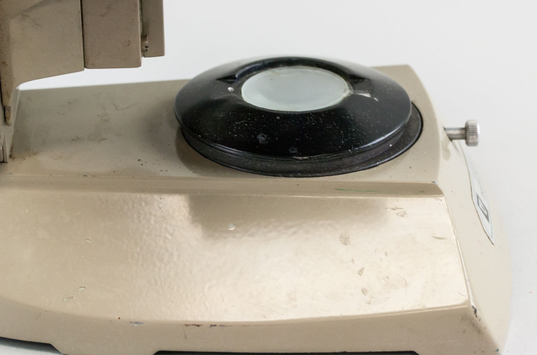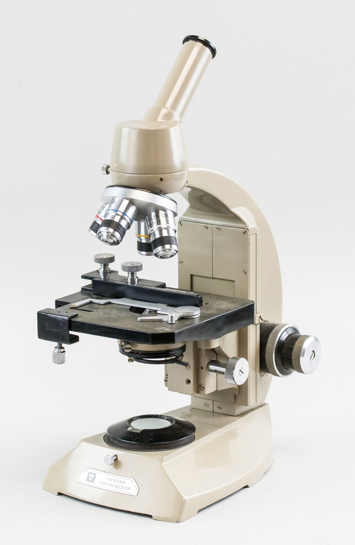 Microscope. Label affixed near base reads "VICKERS INSTRUMENTS". "OLYMPUS TOKYO 10X" stamped on the eye piece. 40 x 23 cm, 4900 grams. Missing power adapter