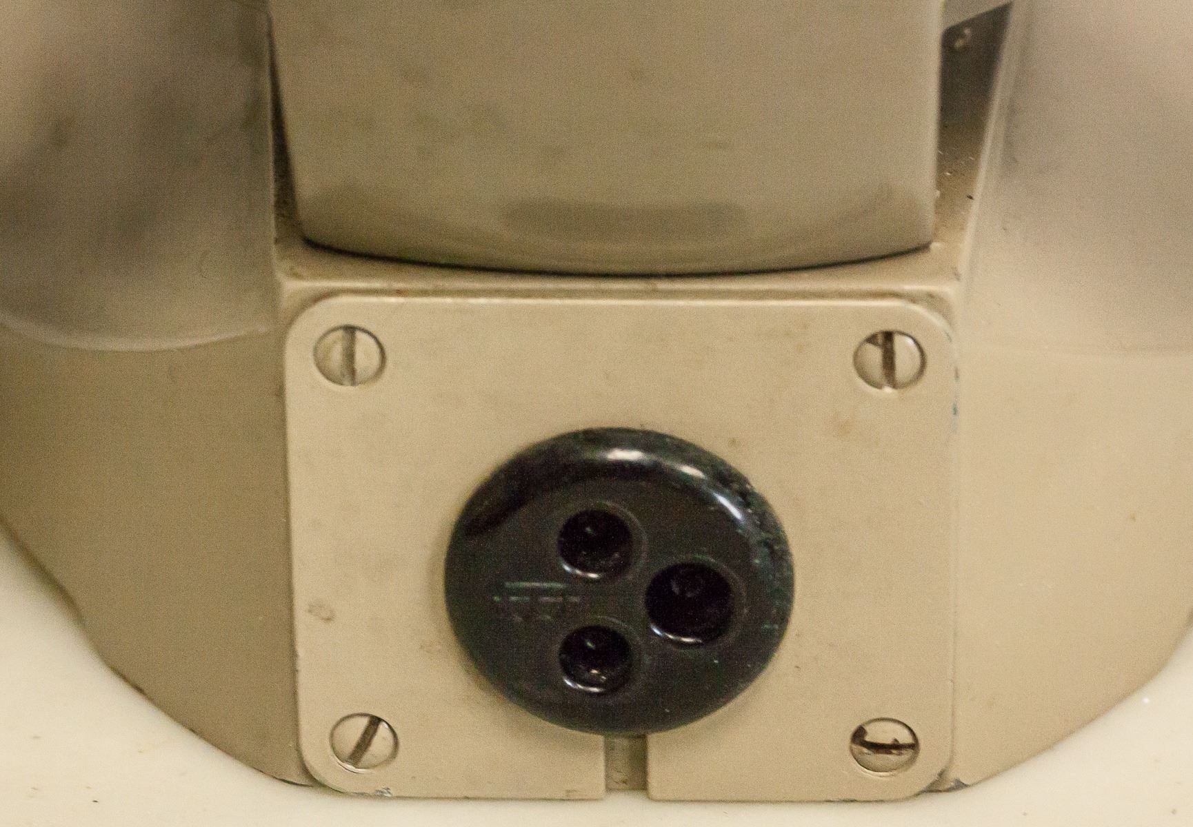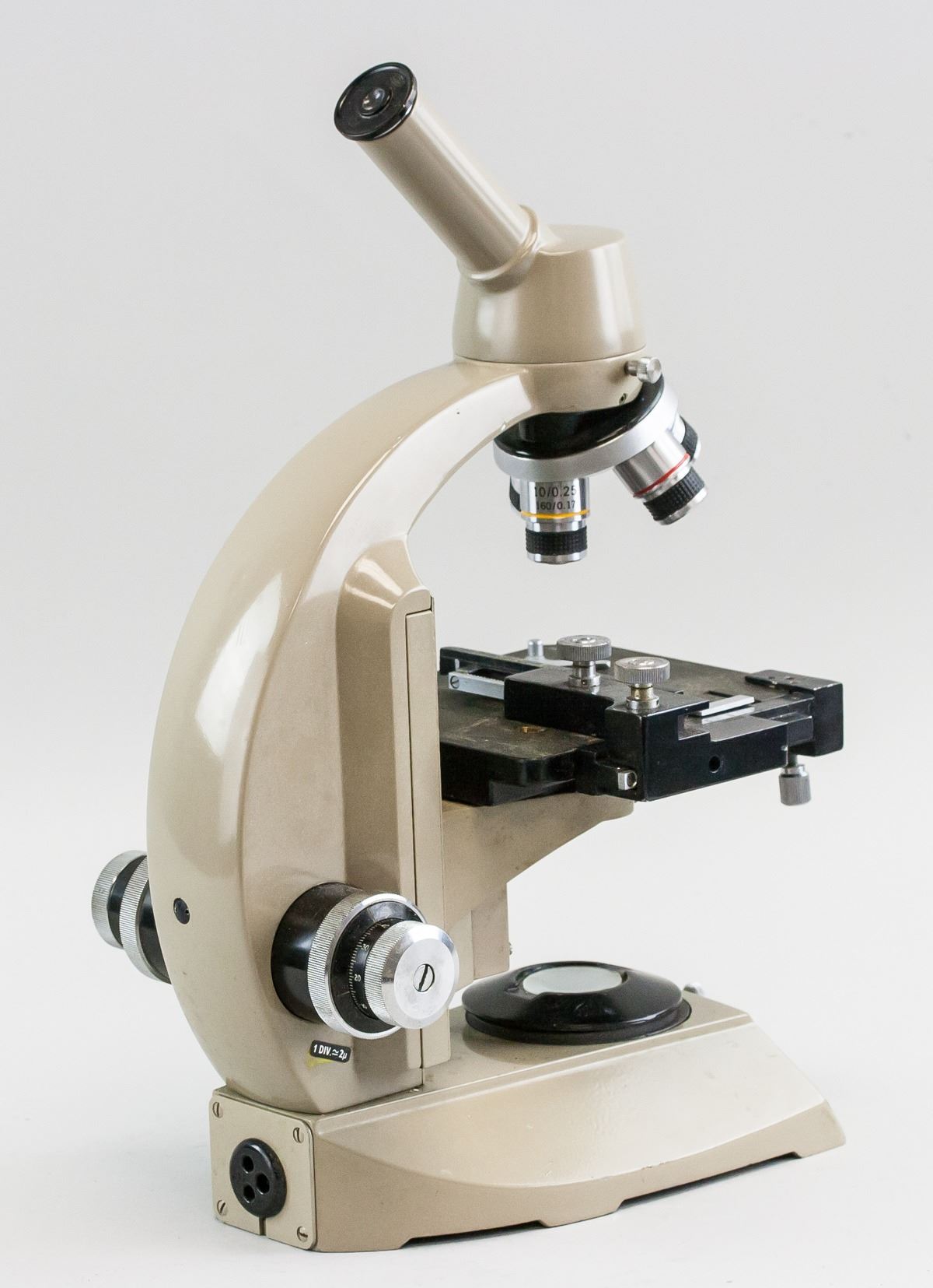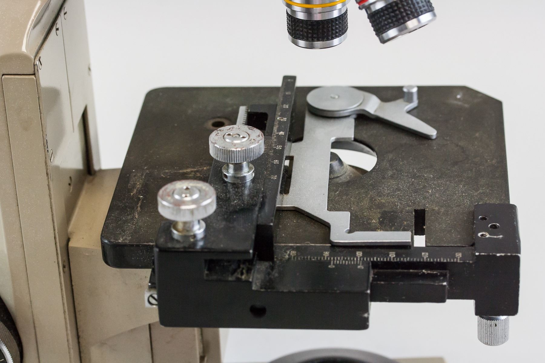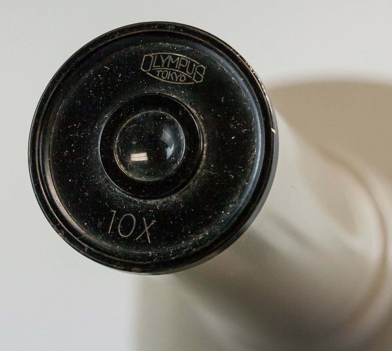 Microscope. Label affixed near base reads "VICKERS INSTRUMENTS". "OLYMPUS TOKYO 10X" stamped on the eye piece. 40 x 23 cm, 4900 grams. Missing power adapter