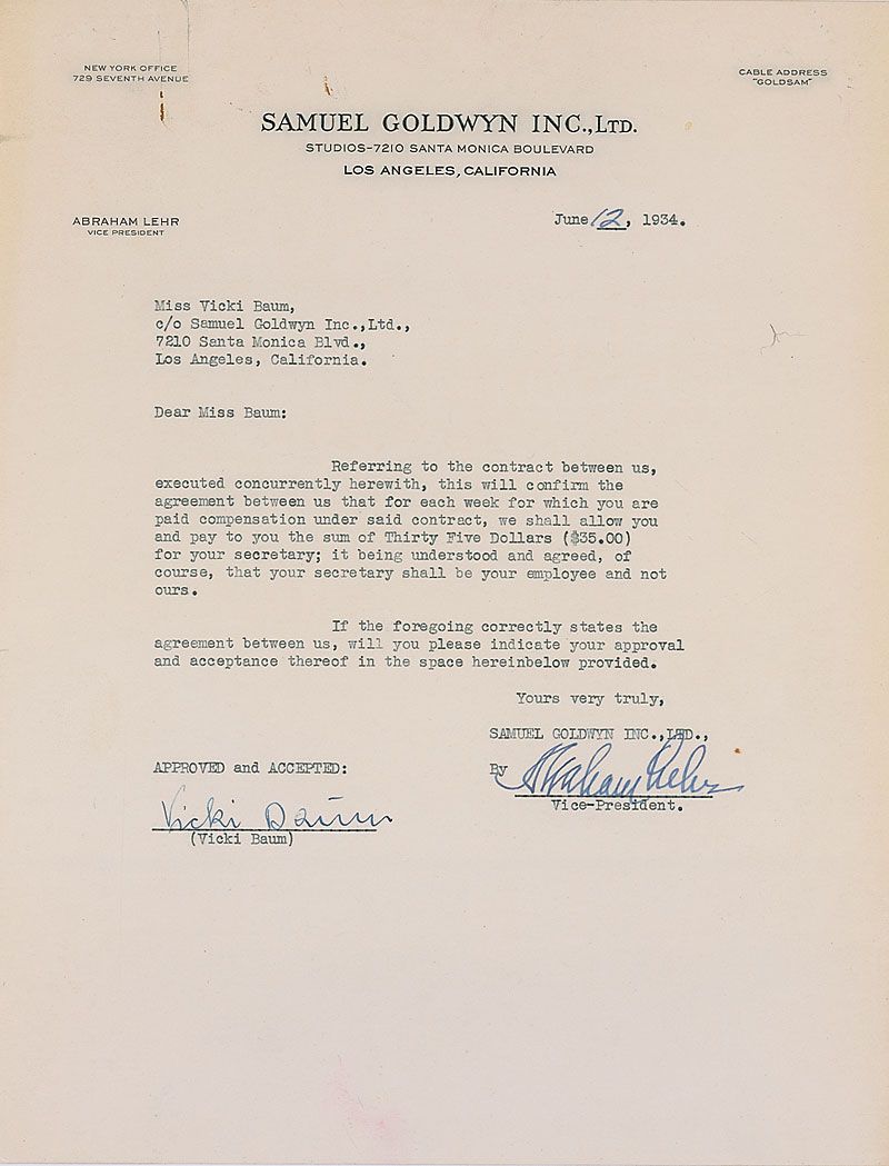 Austrian-born Jewish writer (1888–1960) best known for her 1929 work, People at a Hotel, which was made into the Academy Award–winning film Grand Hotel, starring Greta Garbo. DS one page, 8.5 x 11, June 12, 1934. Agreement between Baum and Samuel Goldwyn Inc. stating that the studio will pay Baum’s secretary’s salary of $35.00 per week while Baum is under contract; the secretary will remain Baum’s employee, not the studio’s. Signed at the conclusion by Baum and countersigned by a studio executive. In fine condition, with a rusty paperclip impression to top edge. Baum wrote more than 50 novels throughout her career, several of which were adapted into motion pictures. A rare document from the woman considered by many to be one of the first modern best-selling authors—only the third Baum we have offered.