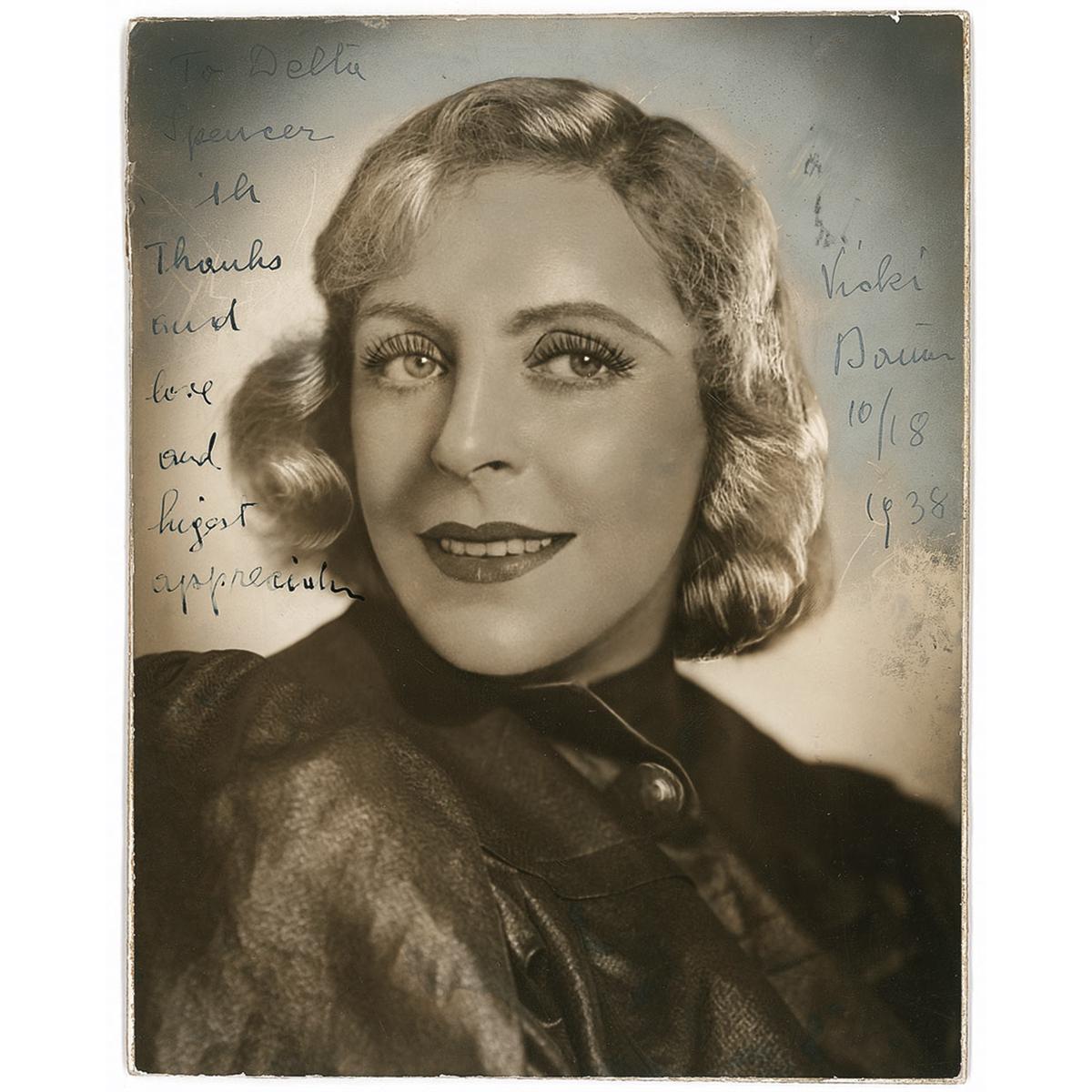 Austrian-born Jewish writer (1888–1960) best known for her 1929 work, People at a Hotel, which was made into the Academy Award-winning film Grand Hotel. Vintage color-tinted pearl-finish 7.75 x 10 photo affixed to same-sized piece of cardboard, signed and inscribed in fountain pen, “To Della Spencer, With thanks and love and higest [sic] appreciation. Vicki Baum, 10/18 1938.” Surface scratches, silvering to some of the darker areas, trimmed edges, irregular ink adhesion to the first two letters of “With,” and areas of discoloration at the the upper corners, otherwise very good condition.
