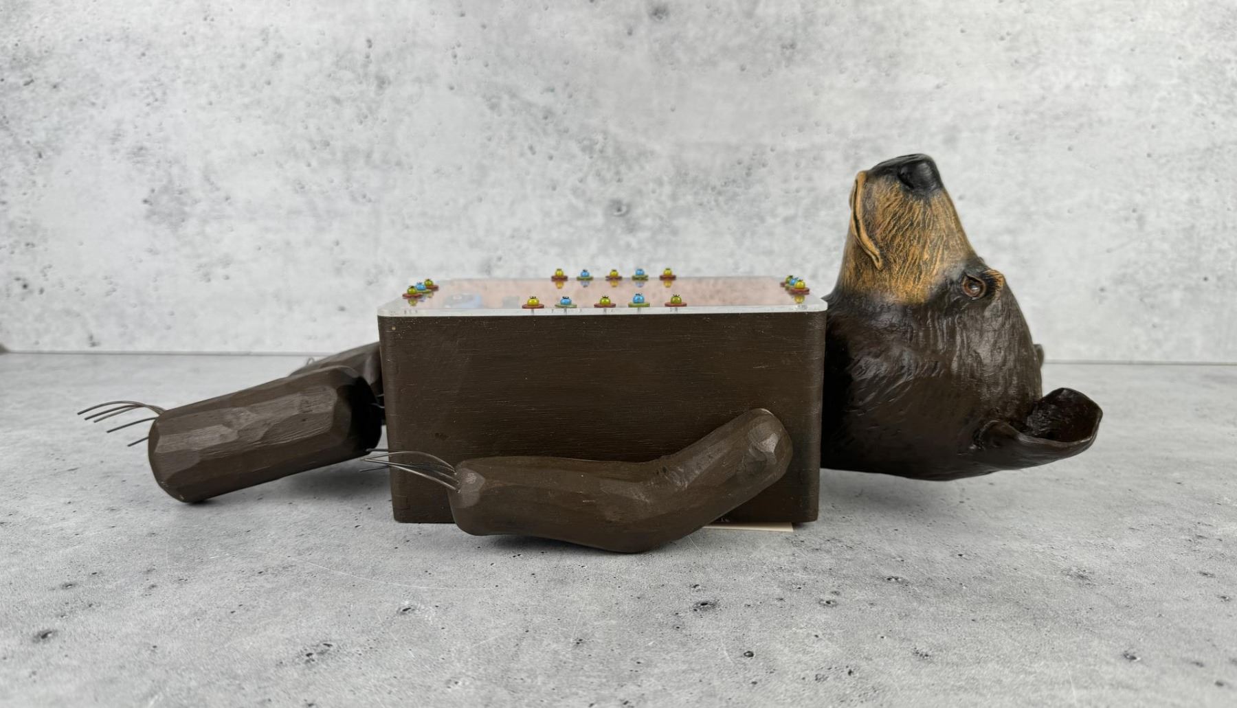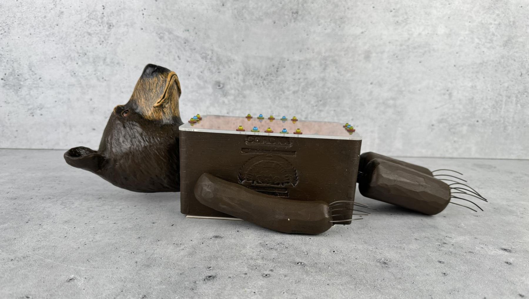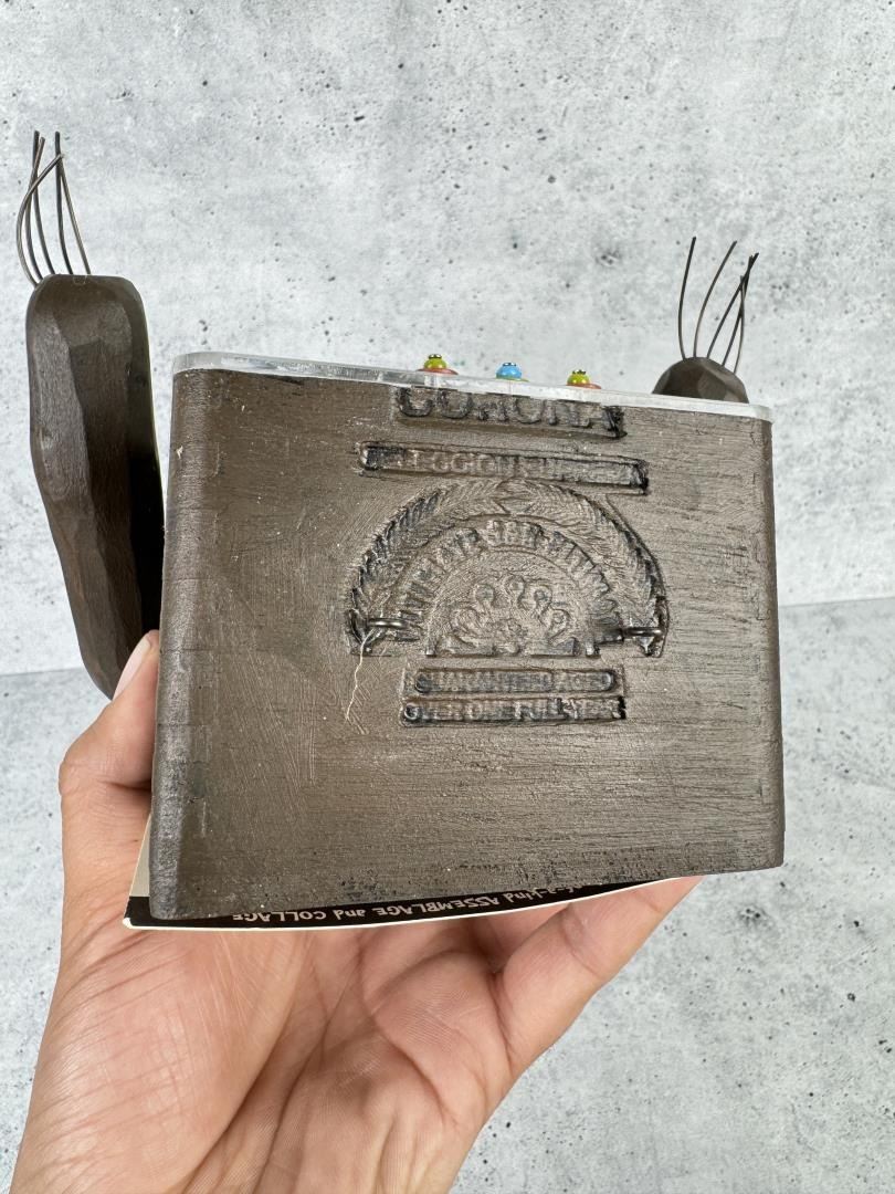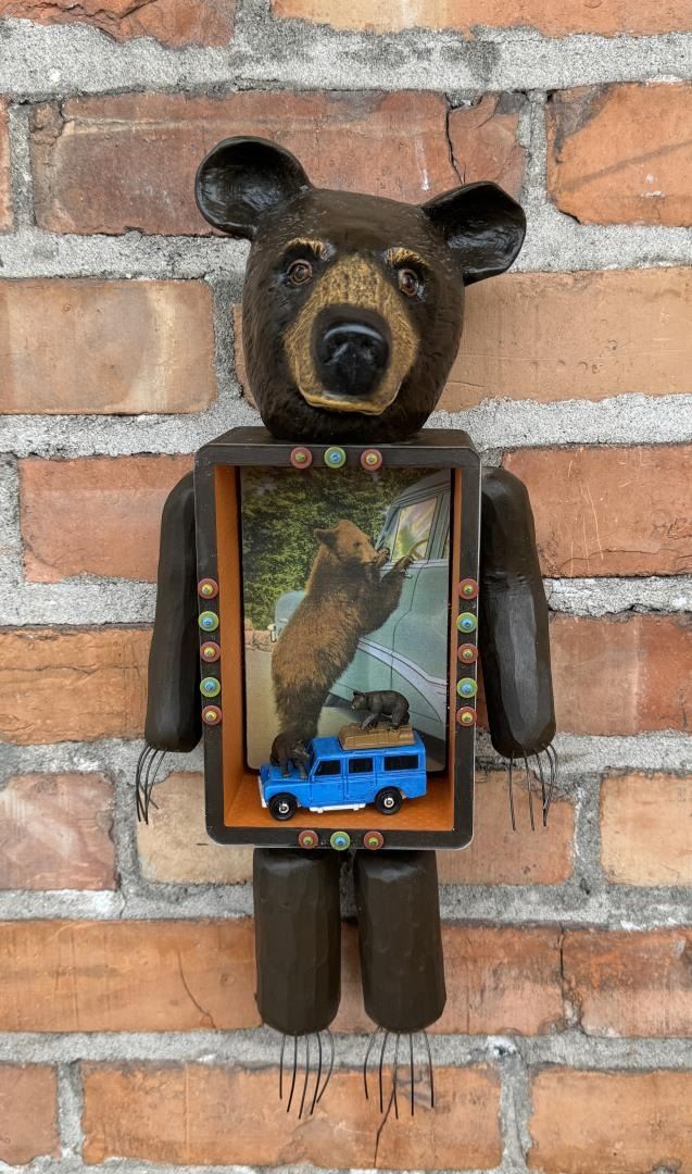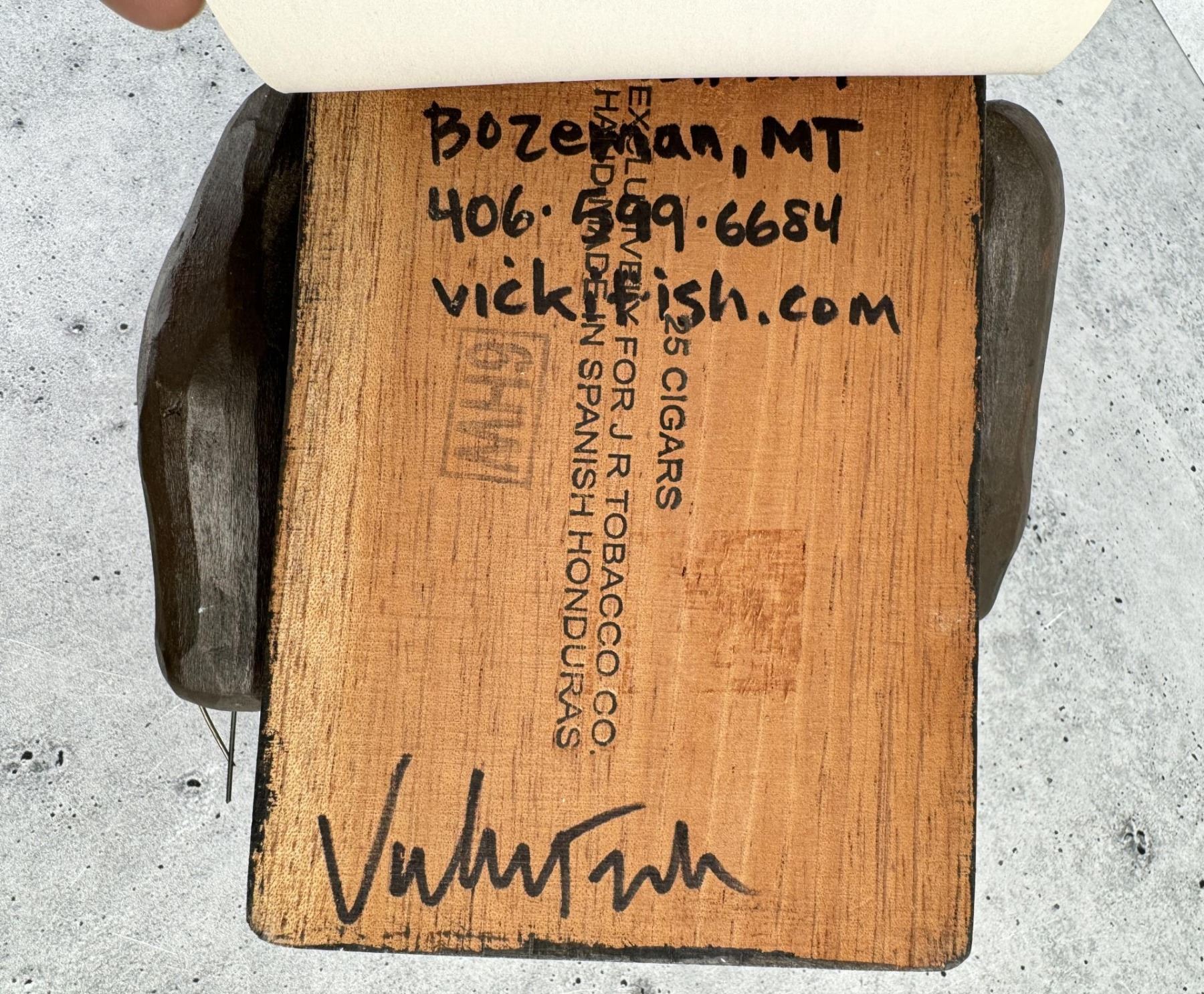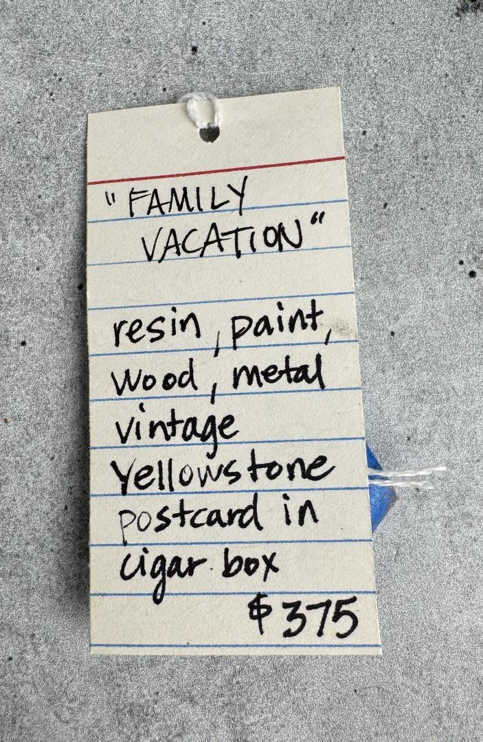 15" by 7" by 5". Title is Family Vacation. Original cost is $375, and she is all sold out on her website. Vicki Fish is a mixed media artist from Bozeman, Montana who creates sculpture, assemblage, collages and paintings that incorporate found objects
