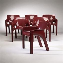 Vico Magistretti Gaudi armchairs, set of six Artimede Italy, 1970 injection molded ABS plastic 23.5"w x 23"d x 29"h Molded manufacturer's marks on bottom.