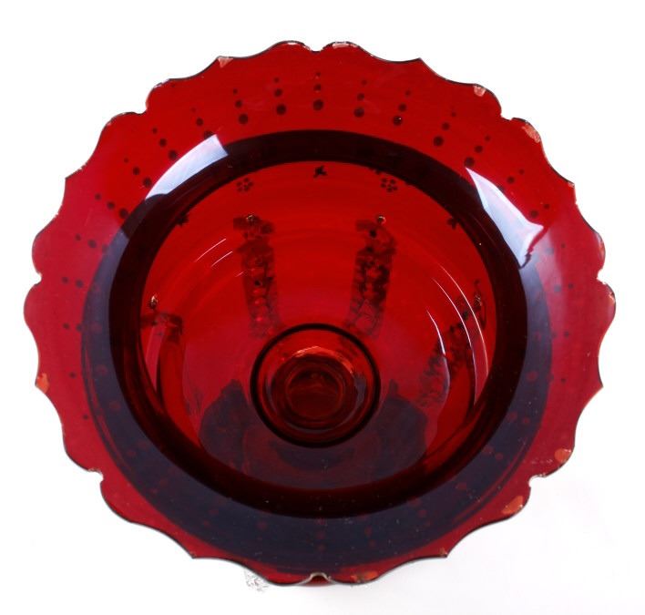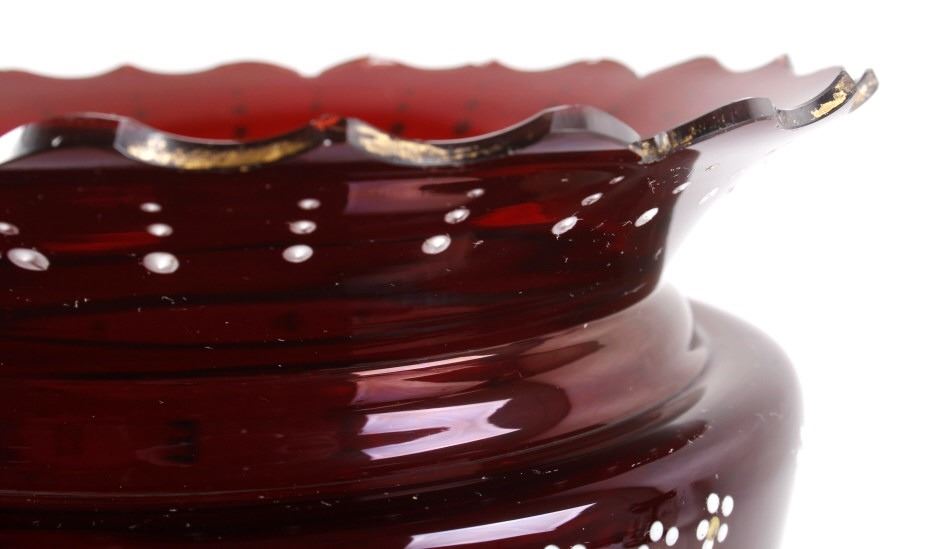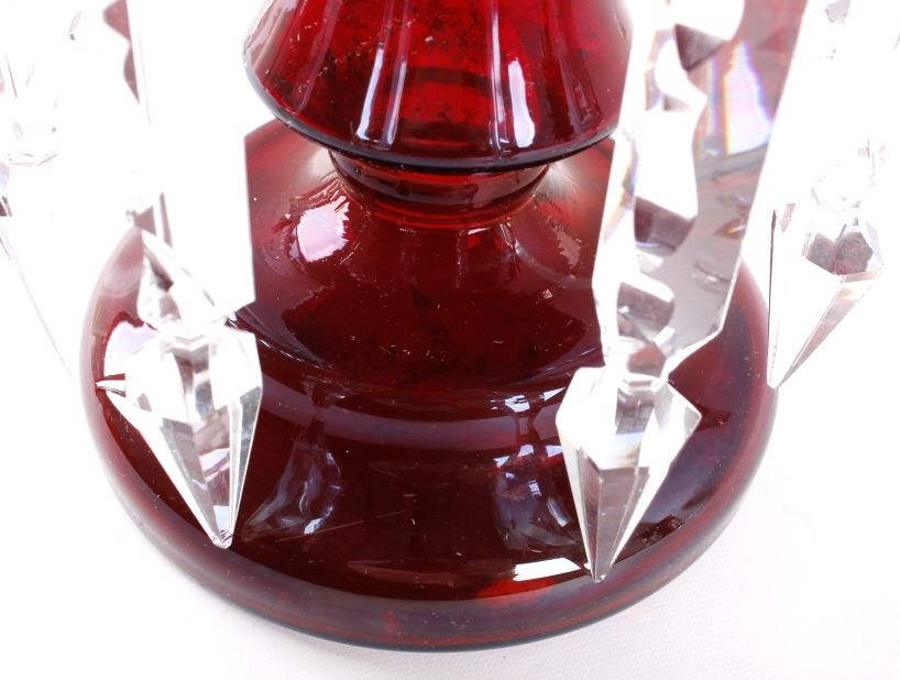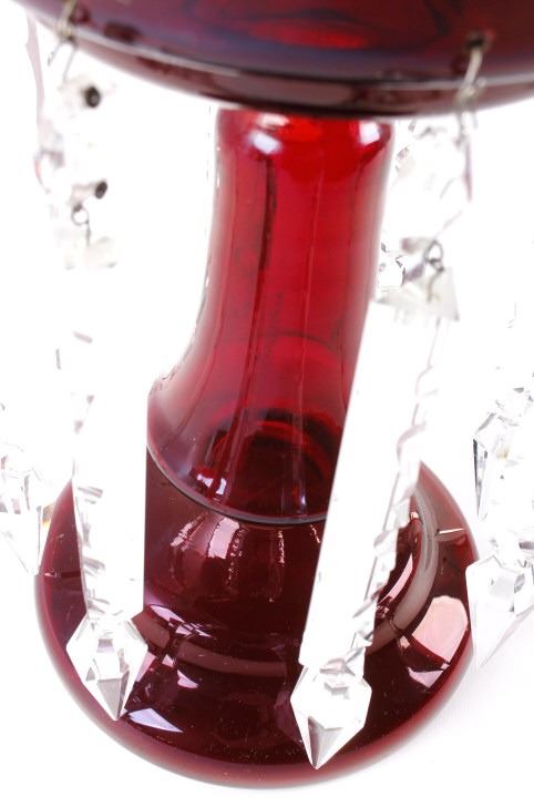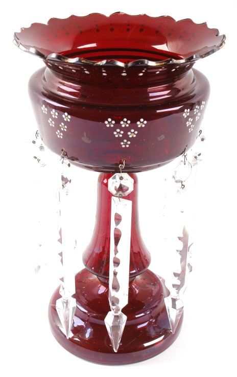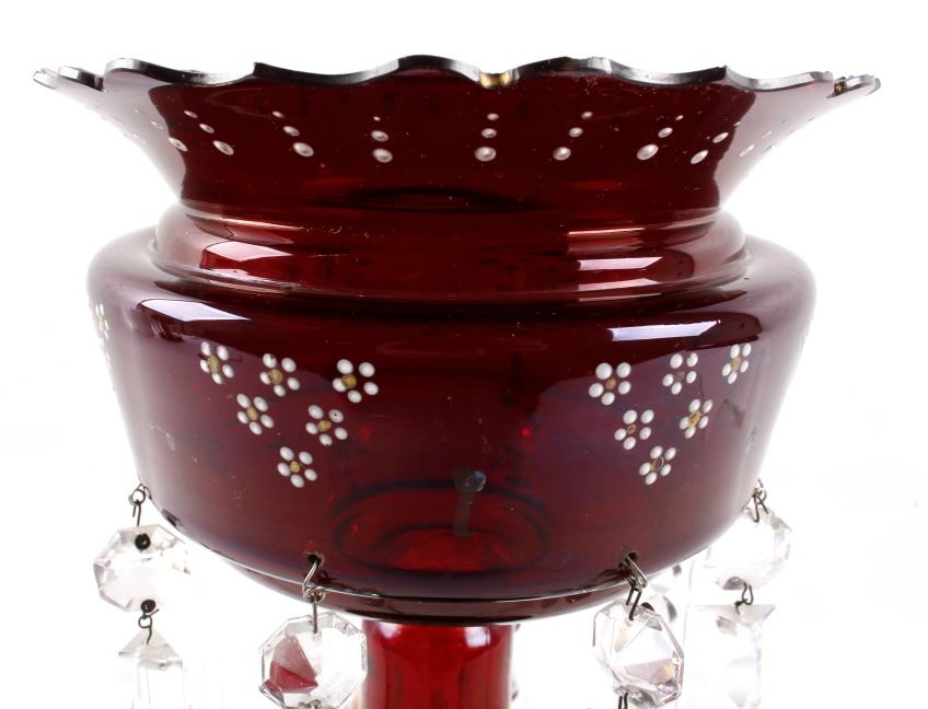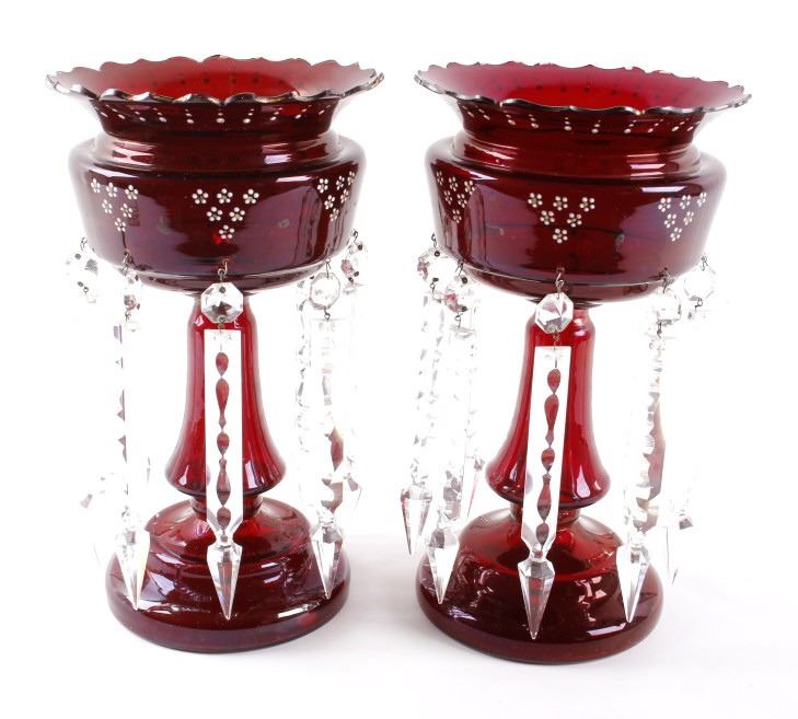 Offered to you in this lot is a pair of two antique Lustre vases, crafted of glass, and finished with a gorgeous cranberry hue. The lustre's are adorned with six enamel flowers above each intricate crystal prism - which there are eight of on each vase. The upper rim of the lustre's are touched with a gold colored finish, and further decorated with a striking band of enamel droplets underneath. The lustre vases originate from the 1870's through 1890's, and boast a great Victorian look. Each Lustre is in good condition overall - only displaying very small scattered chips along the rim. Each vase measures 13" tall, and 7 1/2" across the top.