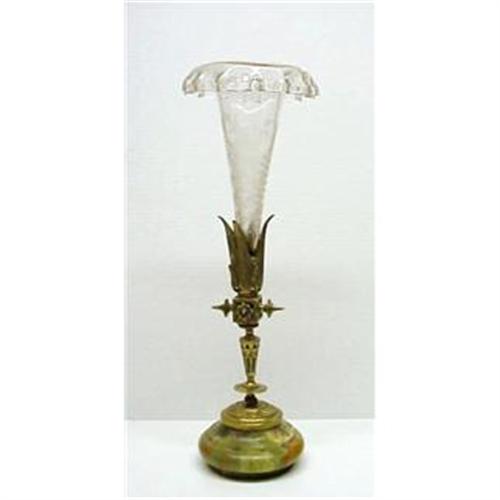 Wonderful and rare center piece, VICTORIAN EPERGNE, Made from delicate, fine ruffled glass, etched in high detail fern pattern, The glass is set in to Victorian ornate etched and figural holder and post, GORGEOUS old brass work!, It stand on HEAVY!, Fantastic pedestal/base that is carved from solid, heavy stone - marble?, that looks like jade colored , It stands about 16" tall and base about 5" in diam. - Very good condition, free of chips, or cracks, The post has tiny rosette and on the other side there is none,This is wonderful luxurious piece,that every home would be proud to have, I did not do any cleaning but it could stand some, US Buyer to pay about 25.00 for shipping, Very heavy!, Please pay via Paypal or Money Order - Thank You so much for looking!