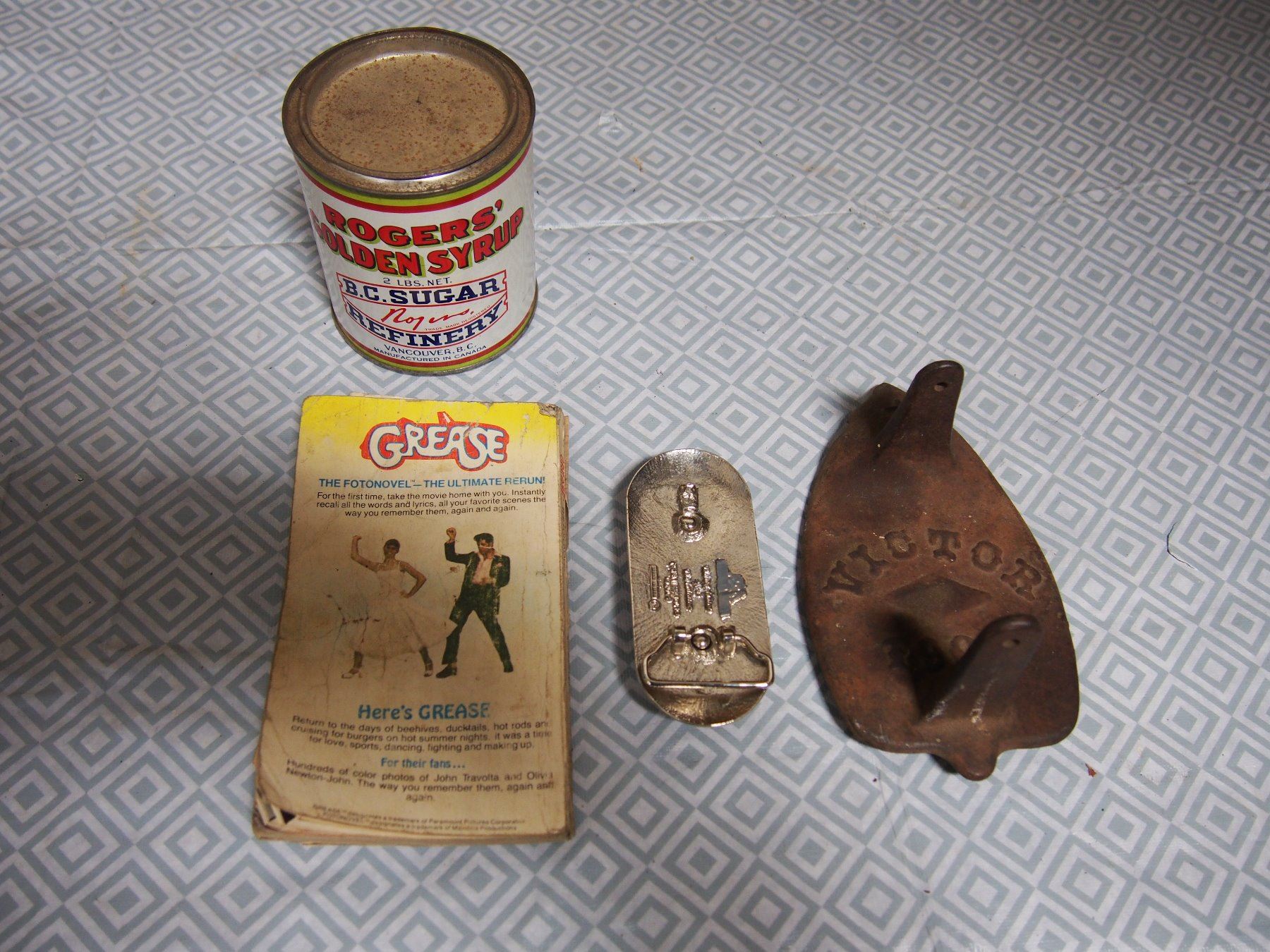 Victor 1906 Cast Piece, Unique Belt Buckle, and Rogers Tin
