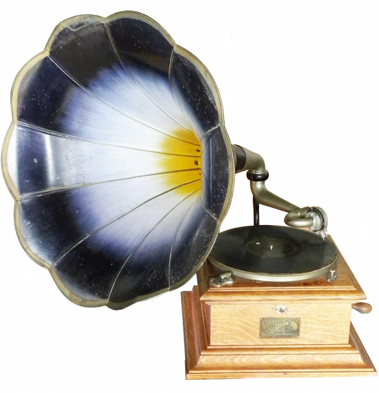 Victor #2 , 78 RPM Player #13131A. Oak cabinet with original painted tin horn. All original working condition. Horn measures 19 1/2 inches.
