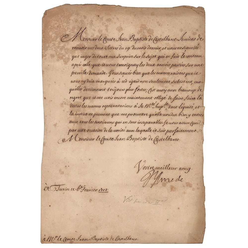 Duke of Savoy from 1675 to 1730, who served as King of Sicily from 1713 to 1720 and King of Sardinia from 1720 to 1730; he left a considerable cultural legacy in Turin, where he remodeled several palaces and built the Basilica of Superga. LS in French, signed “V. Amede,†one page, 8.75 x 13, February 6, 1712. Untranslated letter signed at the conclusion by Victor Amadeus II. In very good to fine condition, with scattered staining.