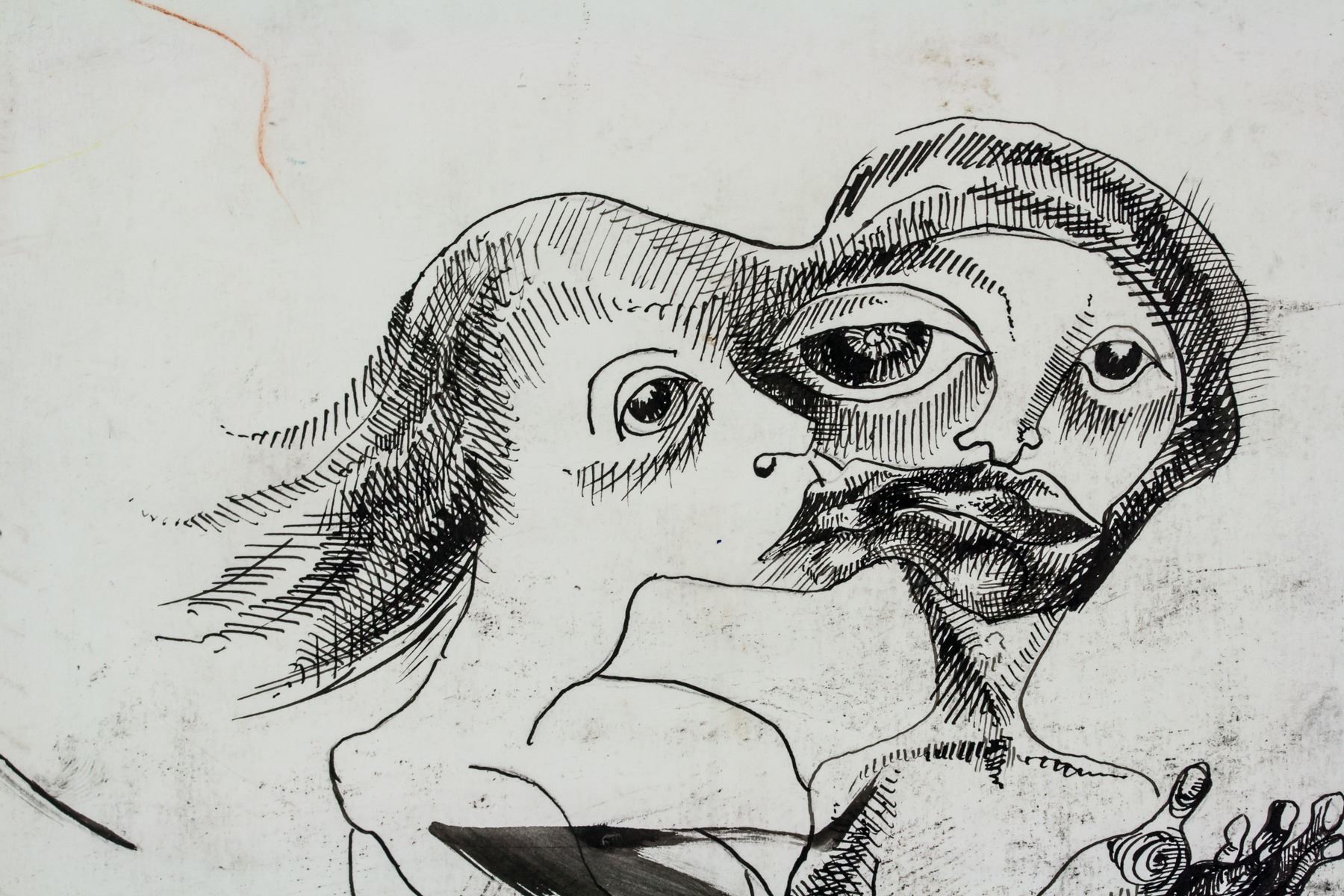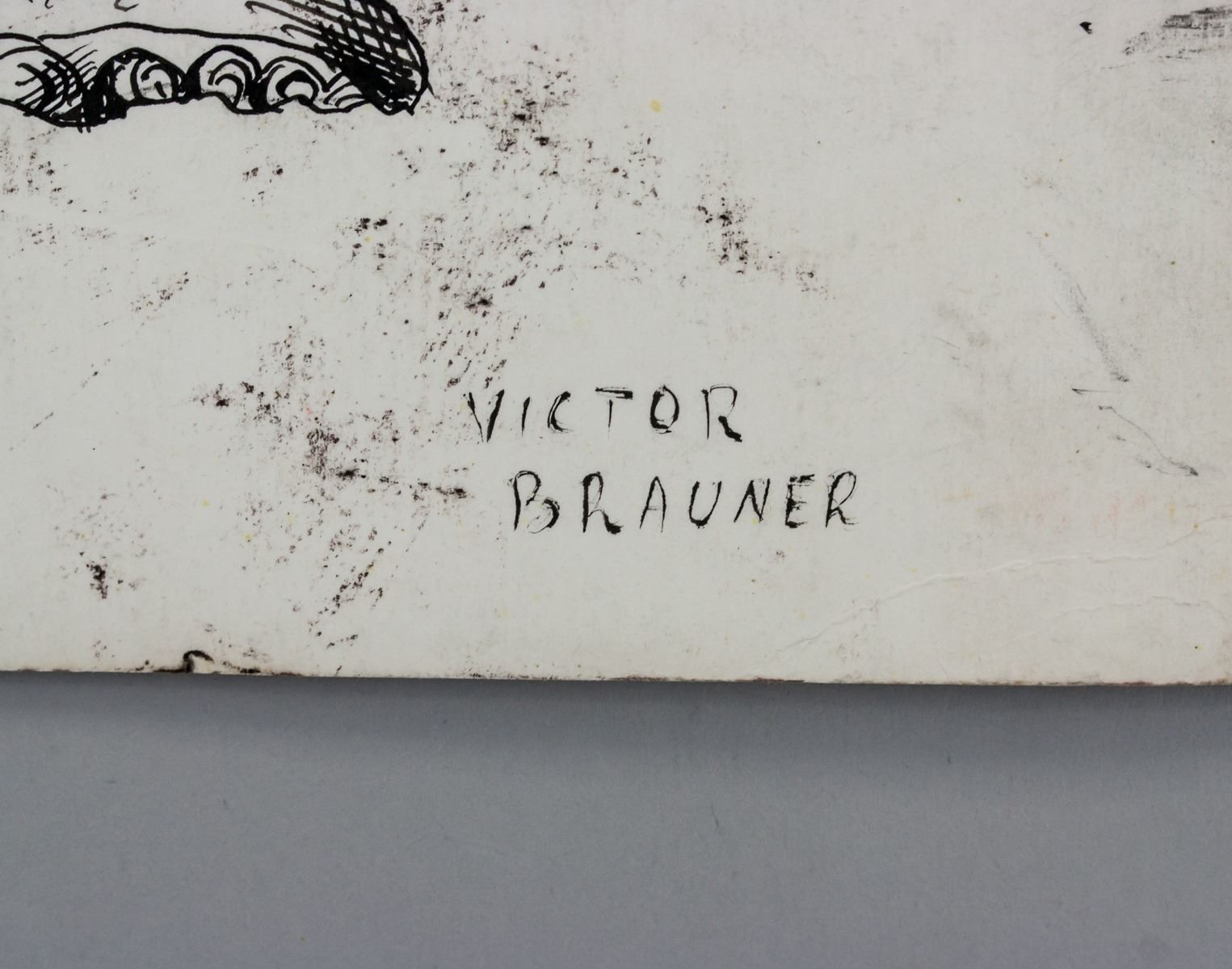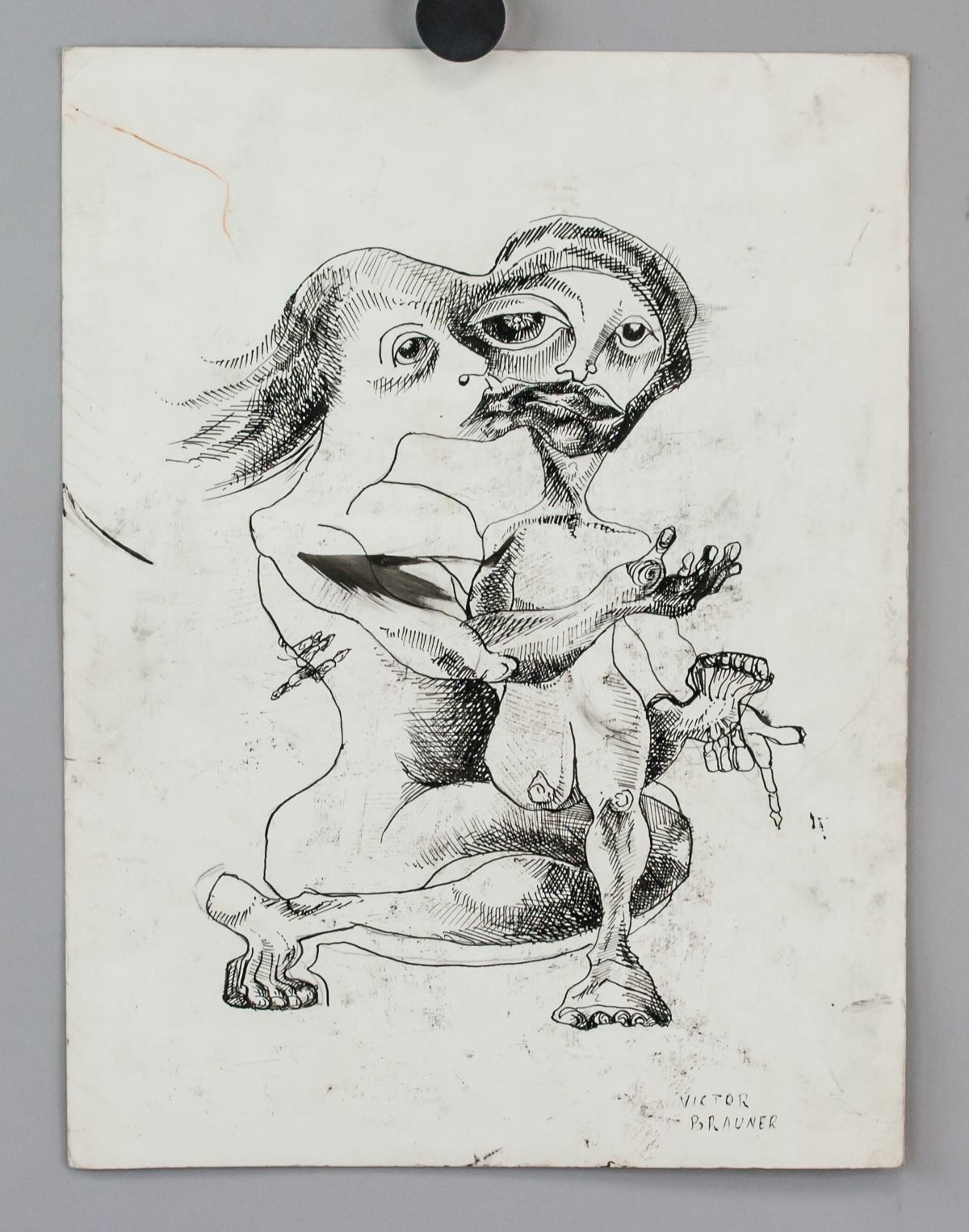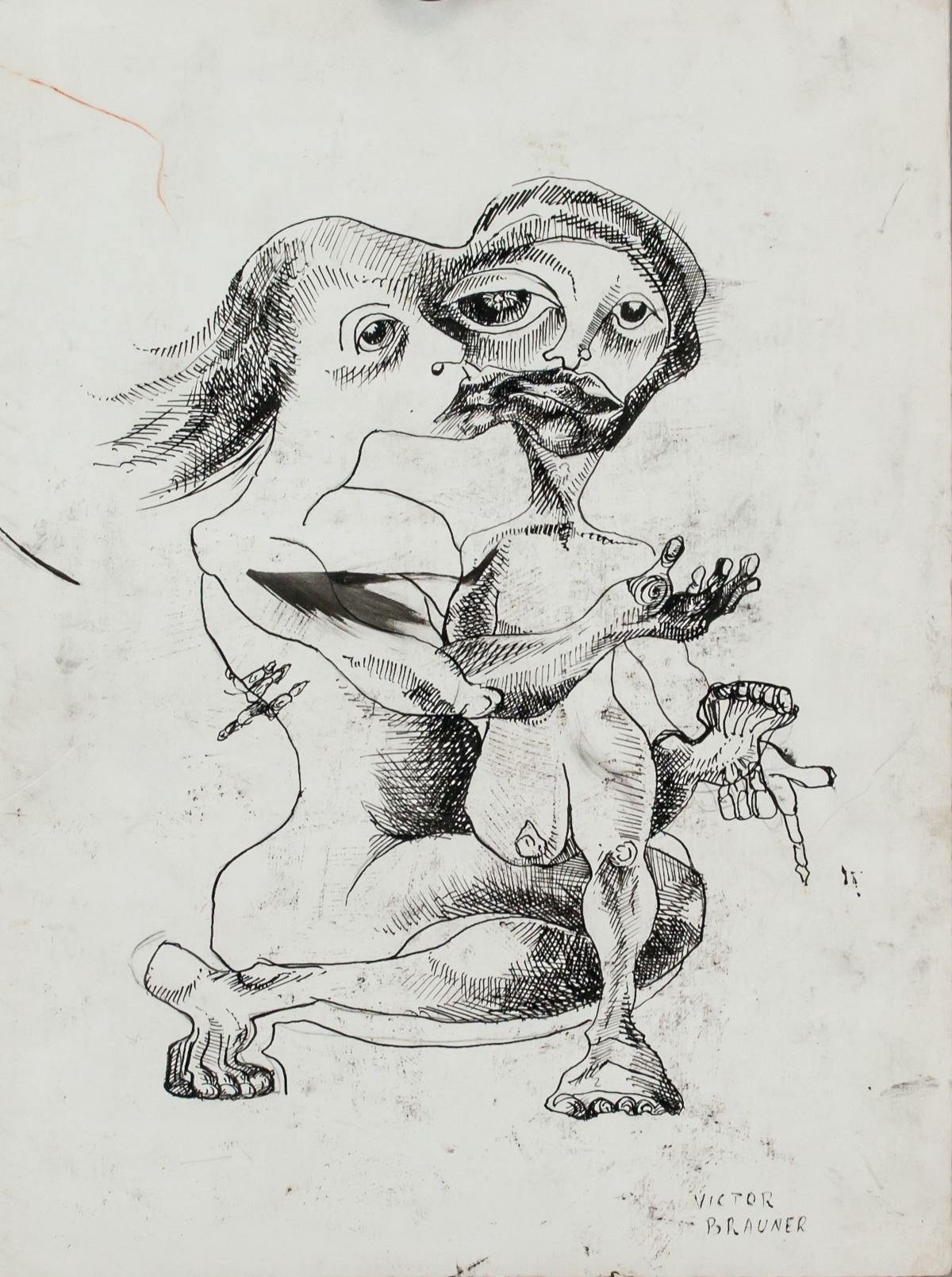 Ink on paper. Featuring two surrealist figures. Signed "Victor Brauner" in the bottom right corner. Attributed to Victor Brauner (1903-1966, Romanian). 23 x 31 cm (9 x 12.2 in). Provenance: This lot carries limited provenance from a Southern Ontario estate