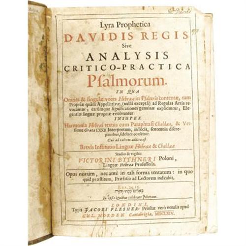 <B>Victor Bythner: <I>Lyra Prophetica Davidis Regis Sive Analysis Critico-Practica Psalmorum</B></I></B></I> (London: Jacobi Flesher, 1664), 467 pages total, marbled boards shelf backed in leather with gilt spine titles, 8vo (6.5" x 8.75"). Bythner's last work, a guide for the critical and grammatical study of the Hebrew psalter. The binding is in fair condition, with the front cover almost completely detached, and noticeable wear to all parts of the binding. The textblock shows typical toning, but is overall in very good condition taken on its own.<BR><BR><b>Shipping:</b> Books & Catalogs (<a target="_blank" href="http://www.heritageauctions.com/common/shipping.php">view shipping information</a>)